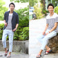 麻ジャケットとサックスカラーパンツで、清涼感のあるスタイリング!