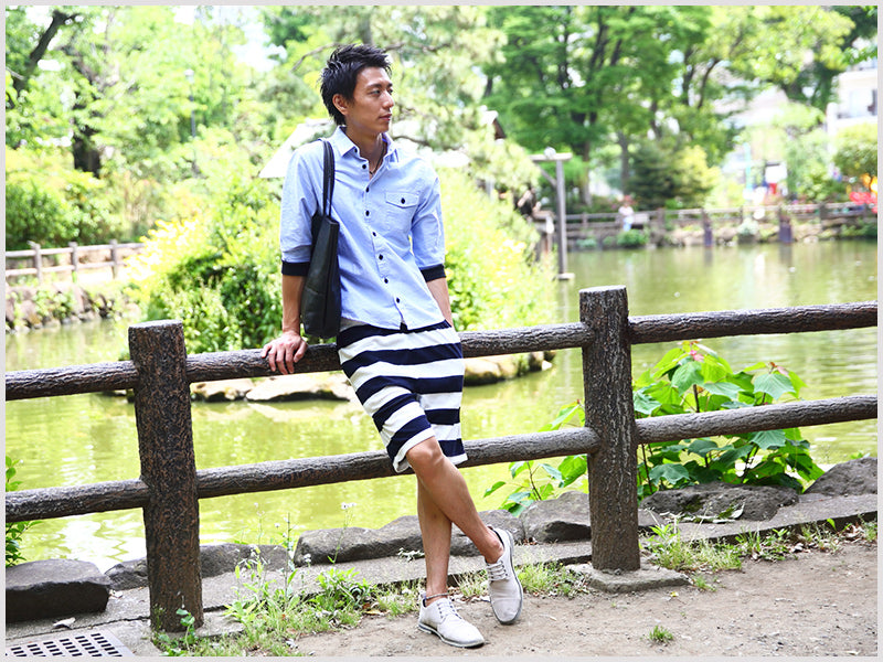 サックスシャツ×ボーダーパンツで夏を感じさせる着こなしに!!