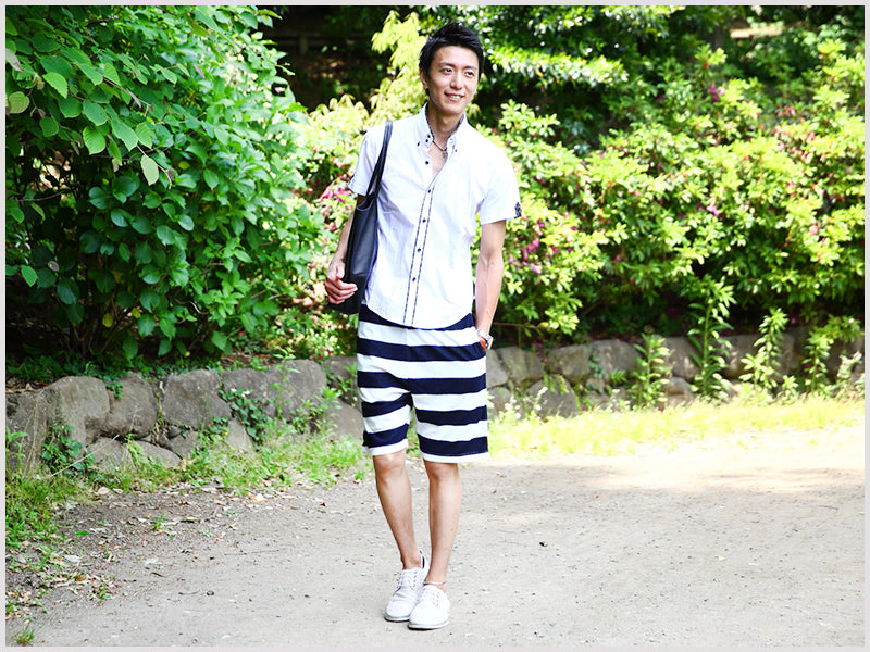 カジュアルなボーダーパンツもホワイトシャツと合わせる事で、