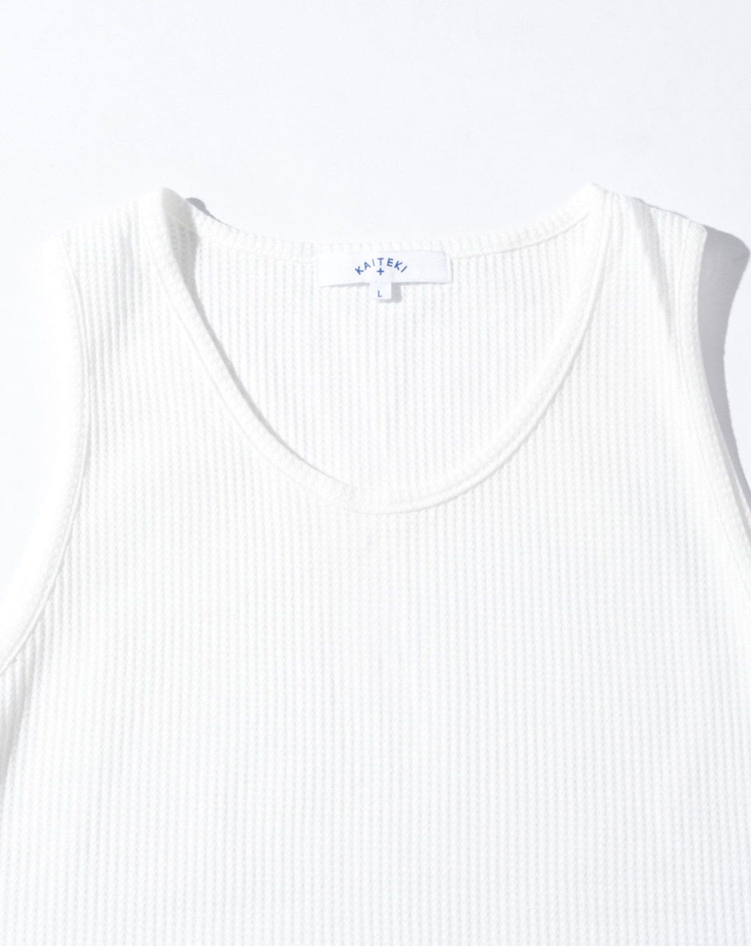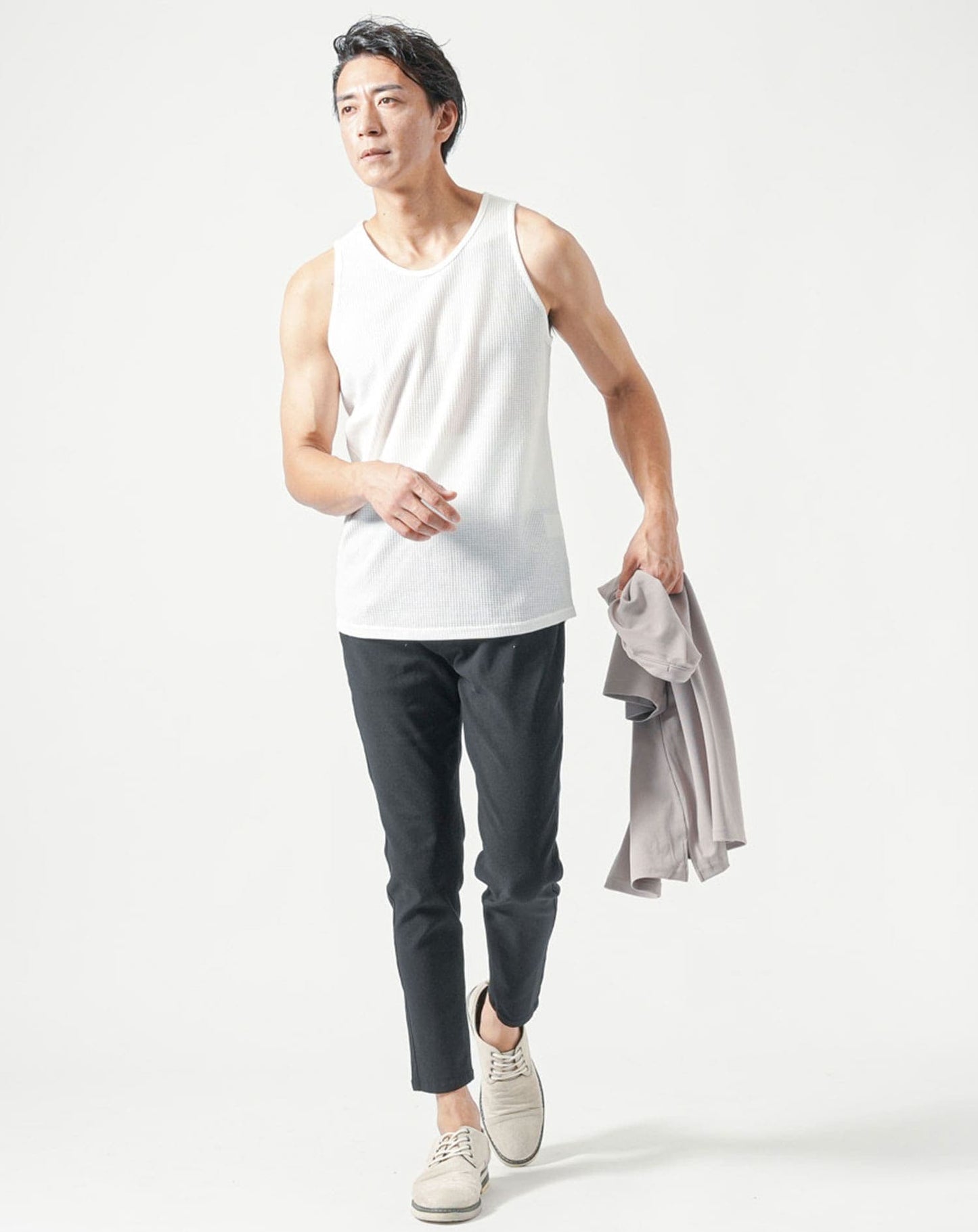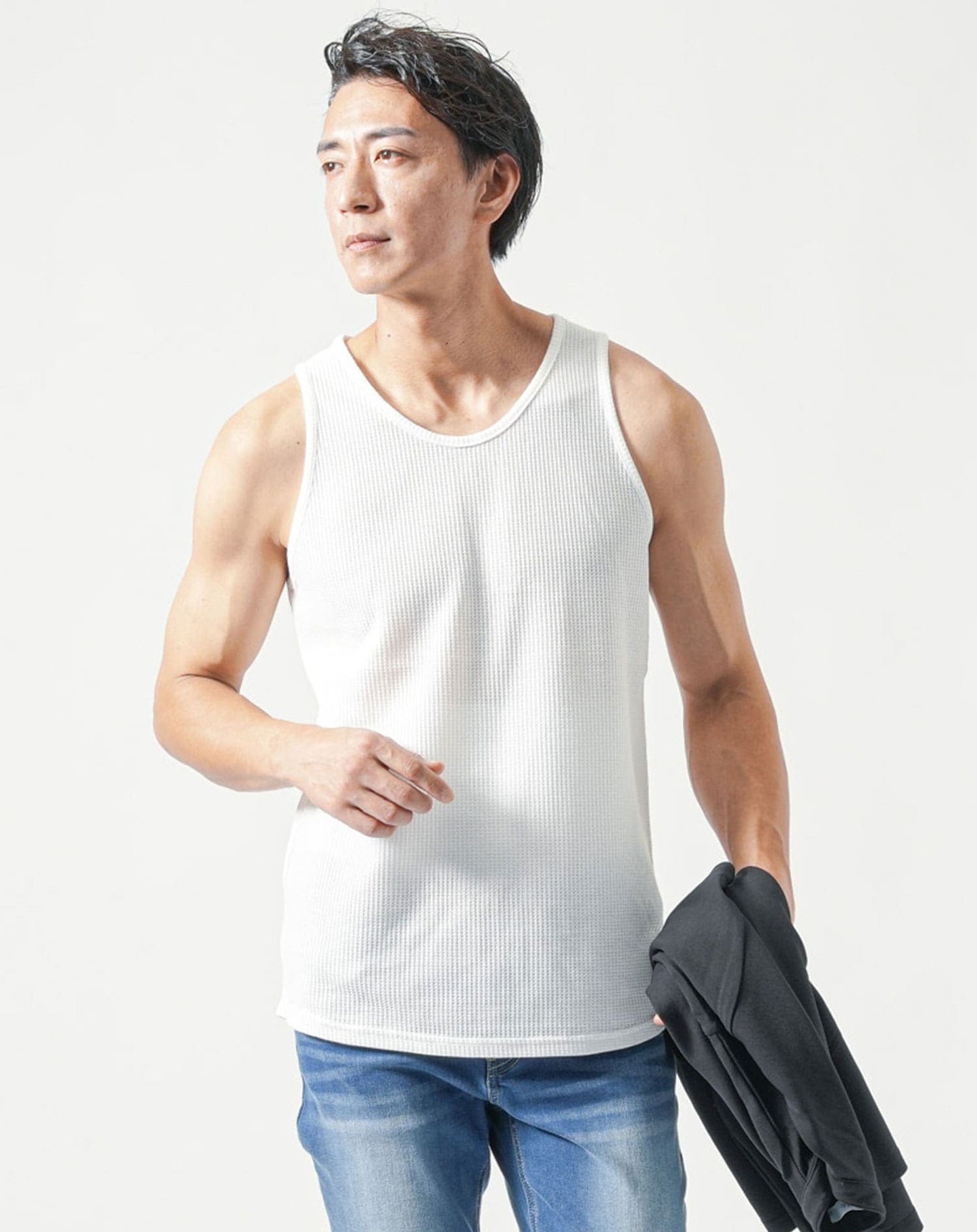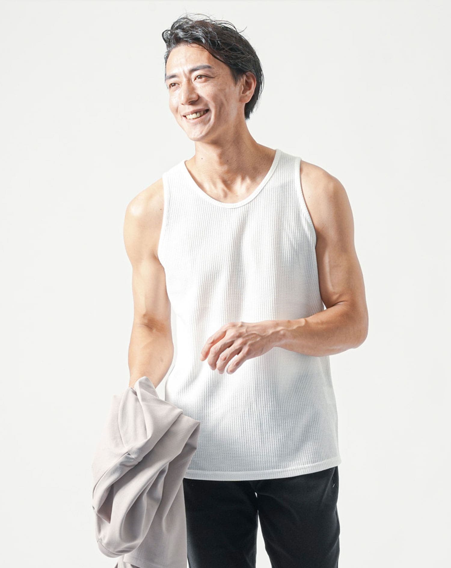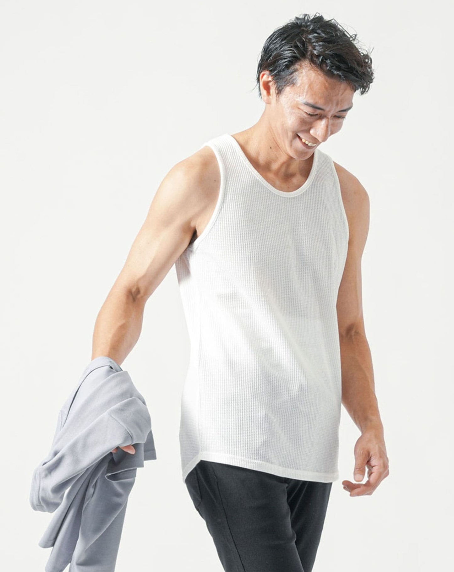 吸水性の高いワッフル素材のタンクトップはやや着丈を長めにすることで、