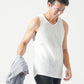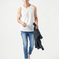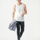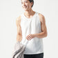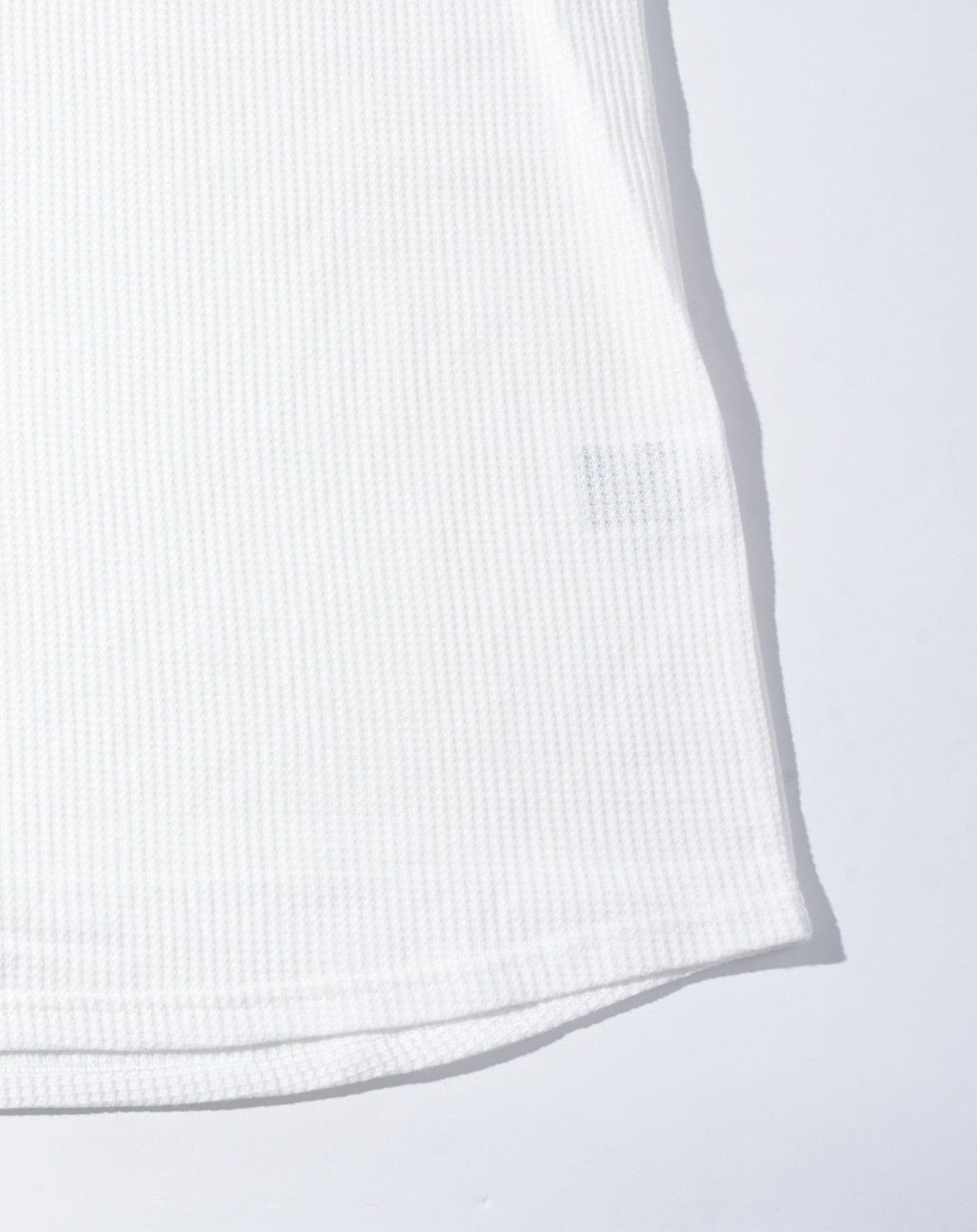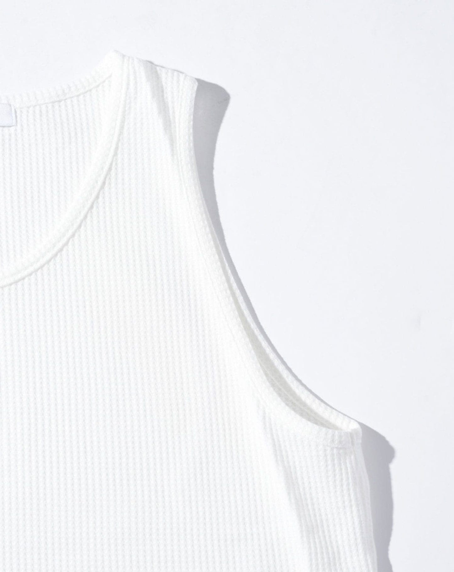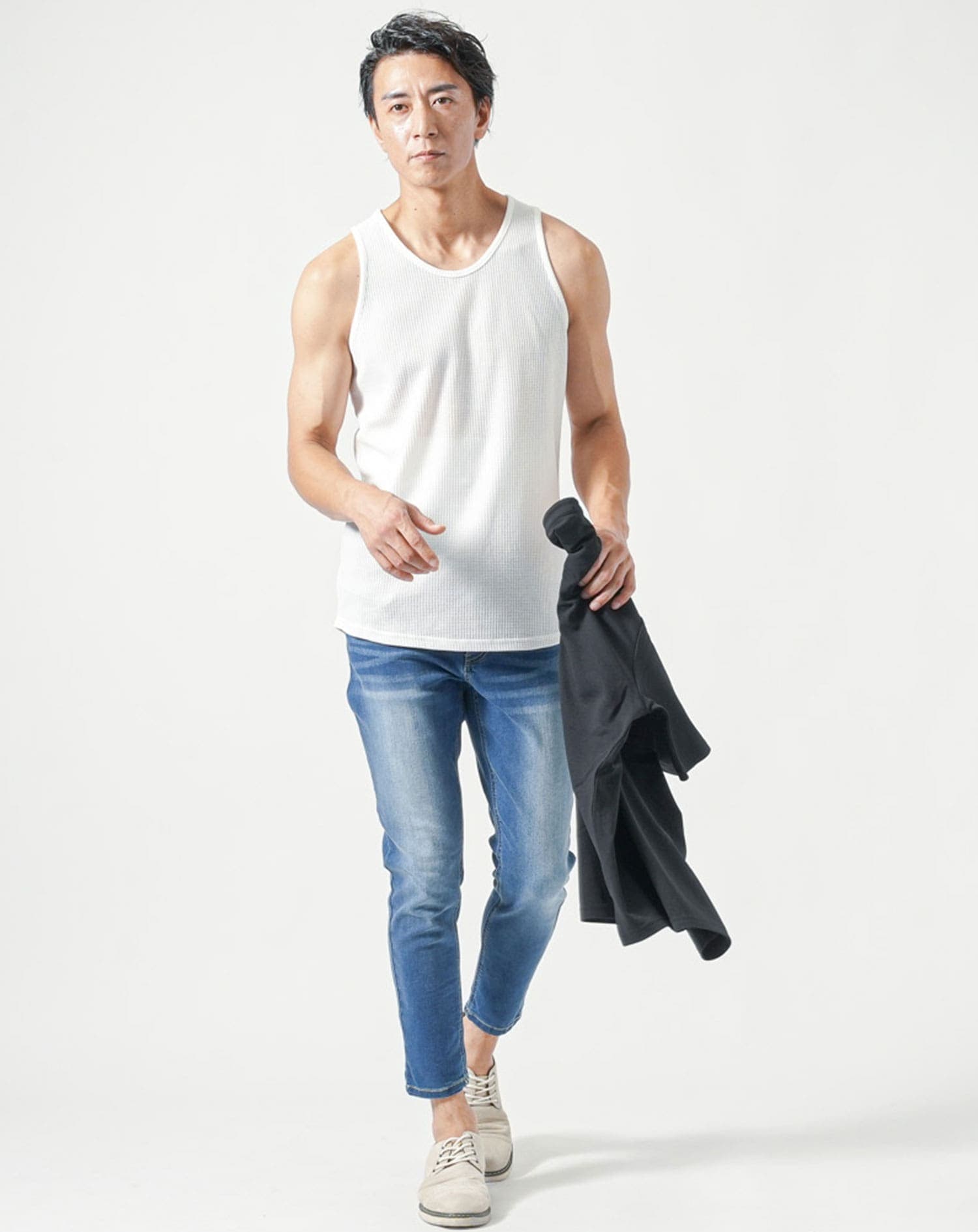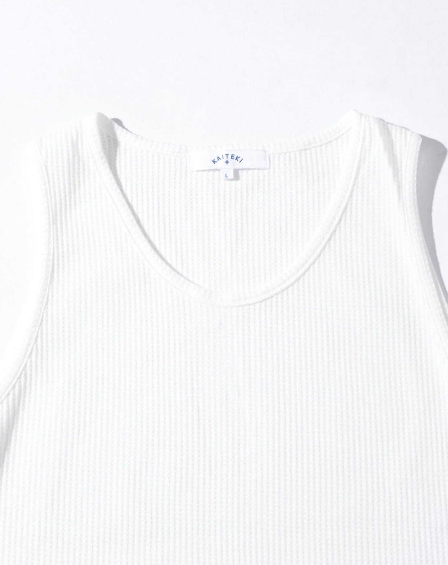吸水性の高いワッフル素材のタンクトップはやや着丈を長めにすることで、