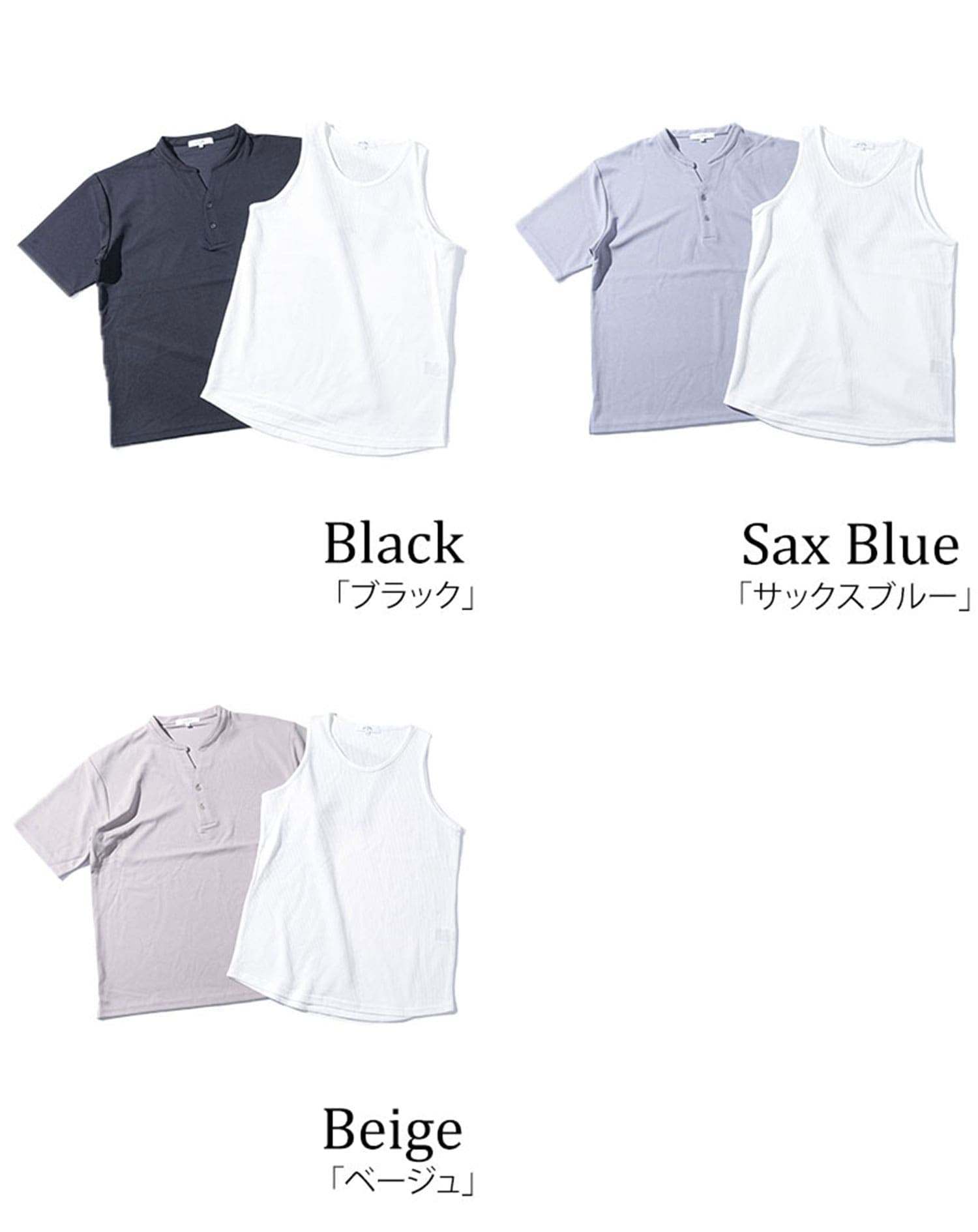 ヘンリーネックの半袖Tシャツとタンクトップの2枚セットになります。