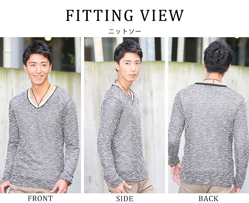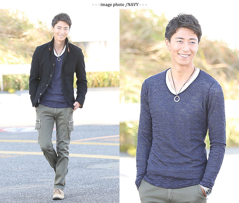 表面に杢のデザインが施されたニットソーと温感加工がされたカットソーがセットになっていてレイヤードスタイルまで楽しめるので他にはないオシャレを楽しむことができちゃうんです!