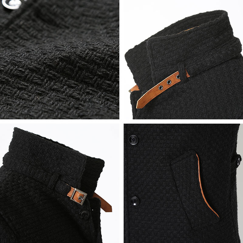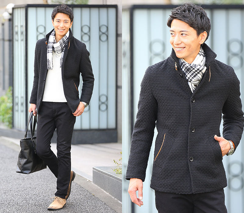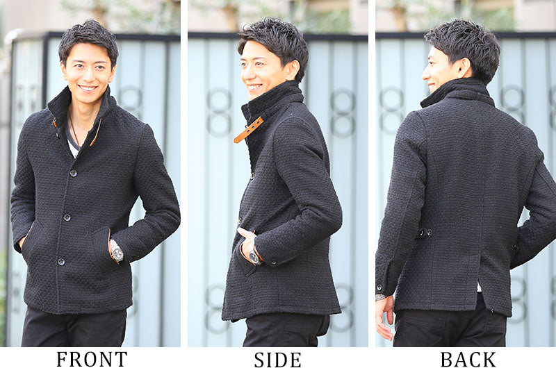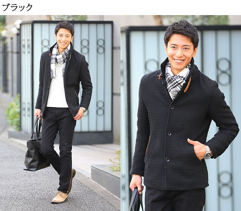 パッと見はシンプルなコートなのですが、よく見ると独特な織りかたになっているんです。凹凸感のあるる生地感が、他のコートにはないオシャレな雰囲気を演出してくれます!散りばめられたPUレザーがアクセントになり、大人っぽさと男らしさを格上げしてくれるんです♪