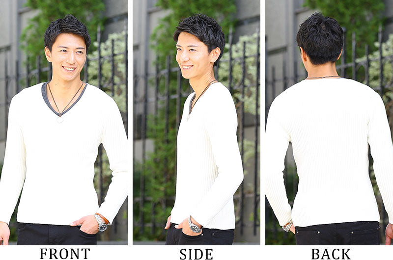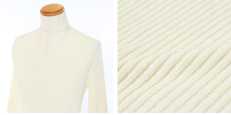 凹凸感ある『針抜き』と、2本の糸を編み込んで作る『二重臼編み』といった編み方の組み合わせで出来たこのニット。程よいVネックなのでITEM3のカットソーとレイヤードさせることで、さらにオシャレ度がアップ!無地ながらもシャレ感が漂うニットソーですよ♪