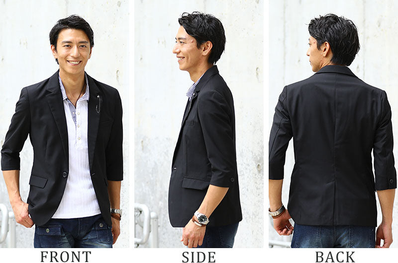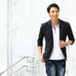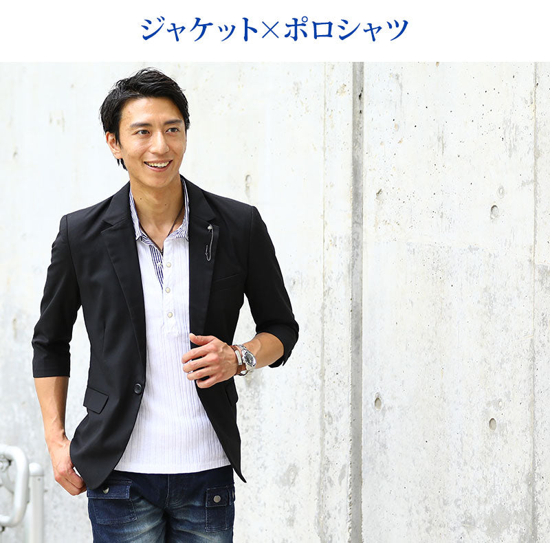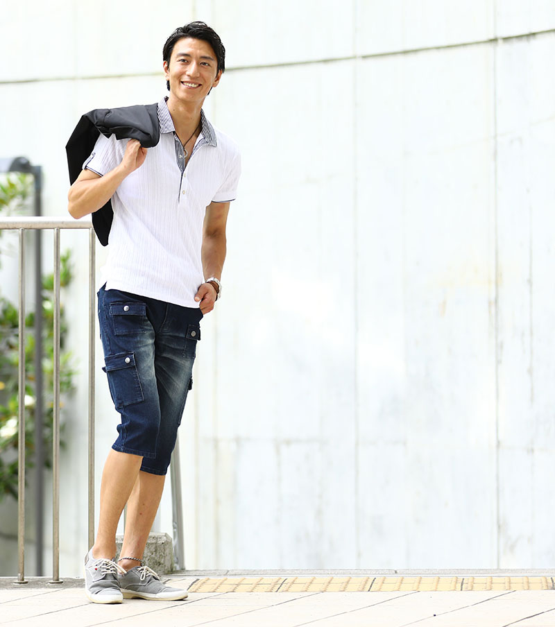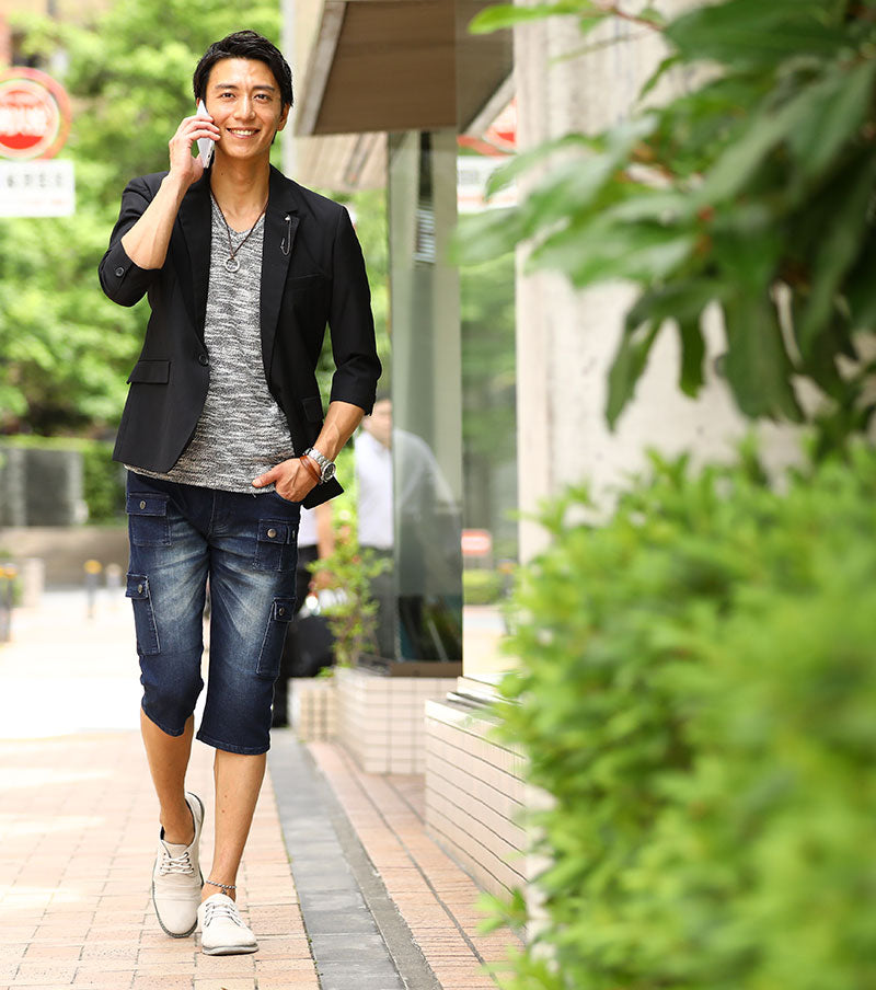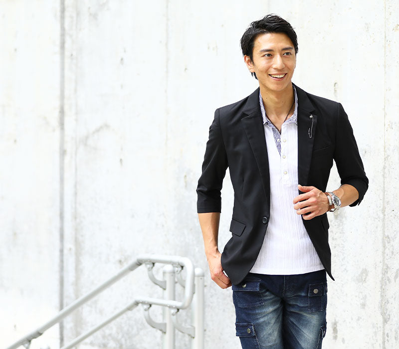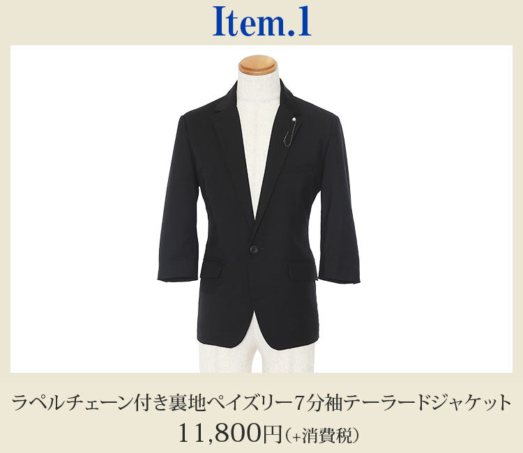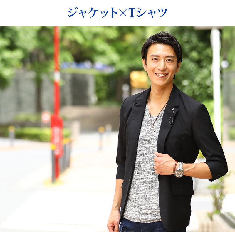 薄着になる夏はオシャレに見えにくい傾向にありますが、ジャケットを1枚羽織るだけで簡単にシャレ感を作ることが出来ます! ベーシックなディテールが落ち着いた大人の雰囲気を作ってくれるんですね。 襟に付けたラペルチェーンがカッコ良い着こなしを演出してくれる理由です♪
