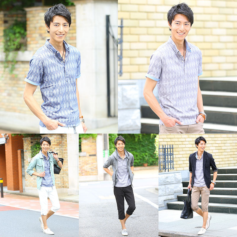 デニムシャツのインナーに入れて、季節感のある爽やかコーディネートに!!ホワイトパンツと合わせる事で、アーガイルデザインが引き立ちよりオシャレ感漂う着こなしに!