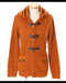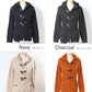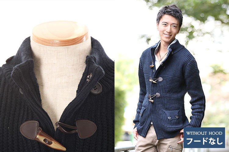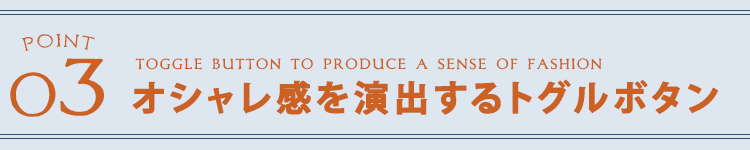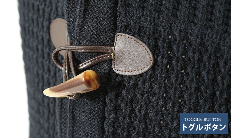 アウターで意外に大事なディテールがボタン。ボタンのデザイン次第でアウターの雰囲気も変わってくるんです。このニットコートにはトグルボタンを採用しました。PUレザーとべっ甲カラーっぽい色ムラのある色味が、上品さに加えオシャレ感を作ってくれているんです。ダッフルコートにはよく使われるトグルボタンですが、色味にもこだわっているので他のダッフルコートとは一味違った雰囲気に魅せてくれるんです。