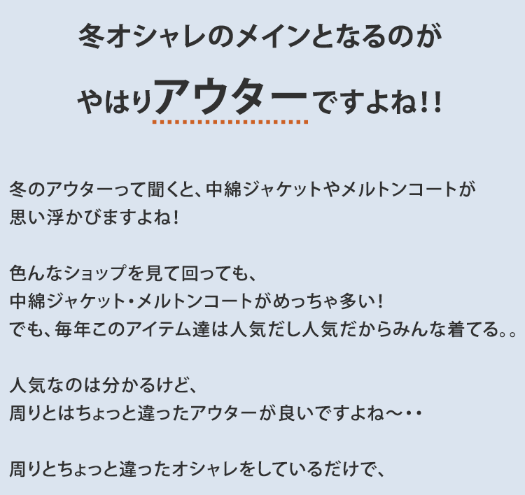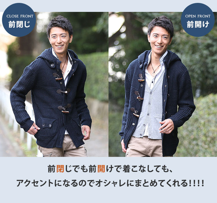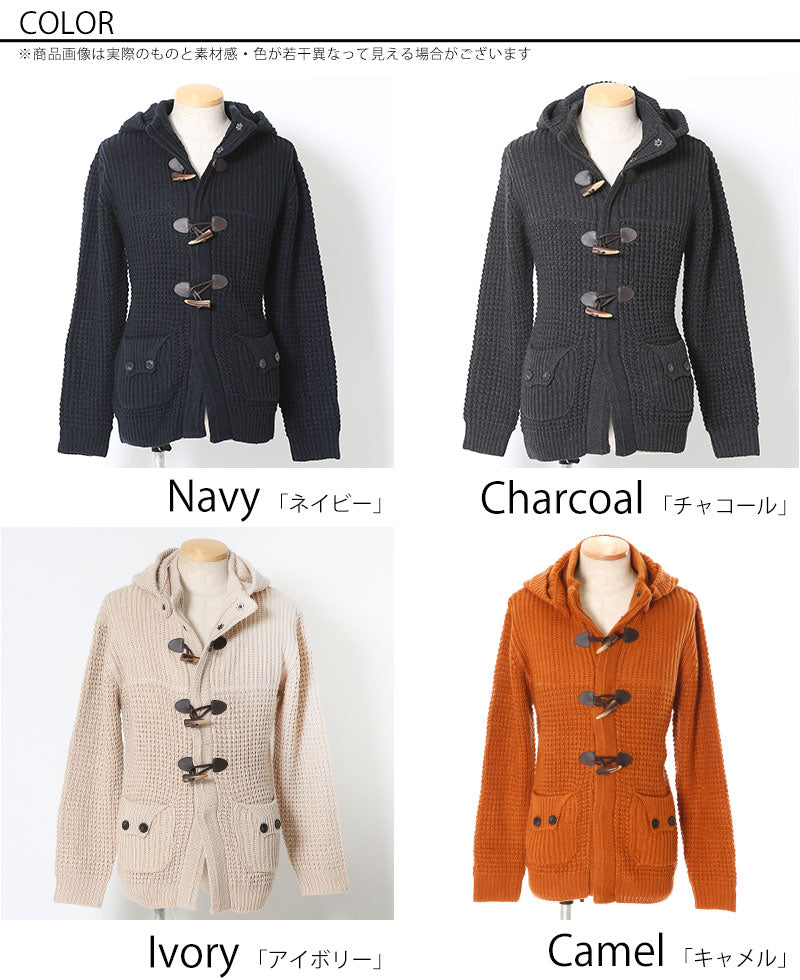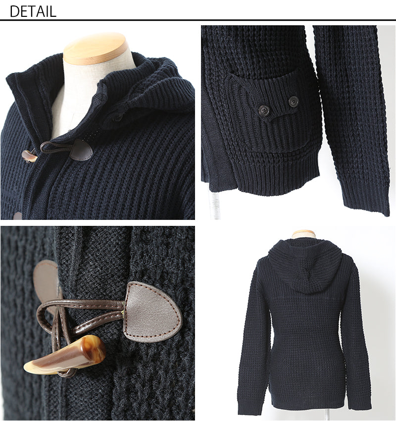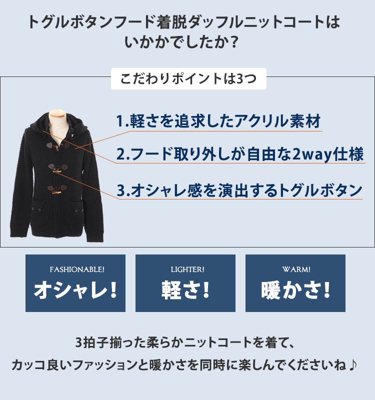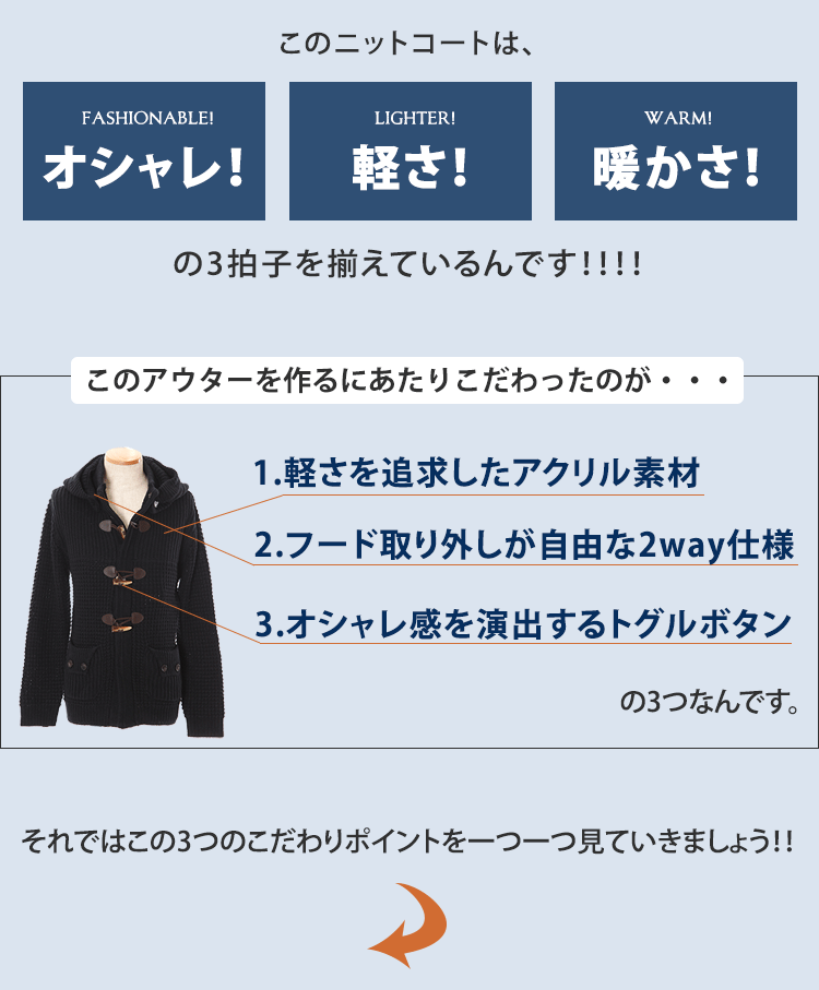 ラクにオシャレが出来るように軽さにこだわりました。ウール素材を使っているニットって重いし着ていて疲れちゃうし、ハンガーにかけた時に 重みで伸びちゃって形が崩れちゃう。。そこでアクリル素材を使用し軽量化を実現させました!!アクリルは柔らかく暖かみのある繊維で、摩擦や引っ張りに対しても耐久性がある。もちろん風を通しにくく防寒性も抜群!人気のPコートやジャケットなどと同じ感覚で着ることができるし、インナーに着こんでいてもラクにオシャレを楽しむ事が出来るんです♪それでいてPコートやジャケットとはまた違った雰囲気を作りだしてくれるんです。