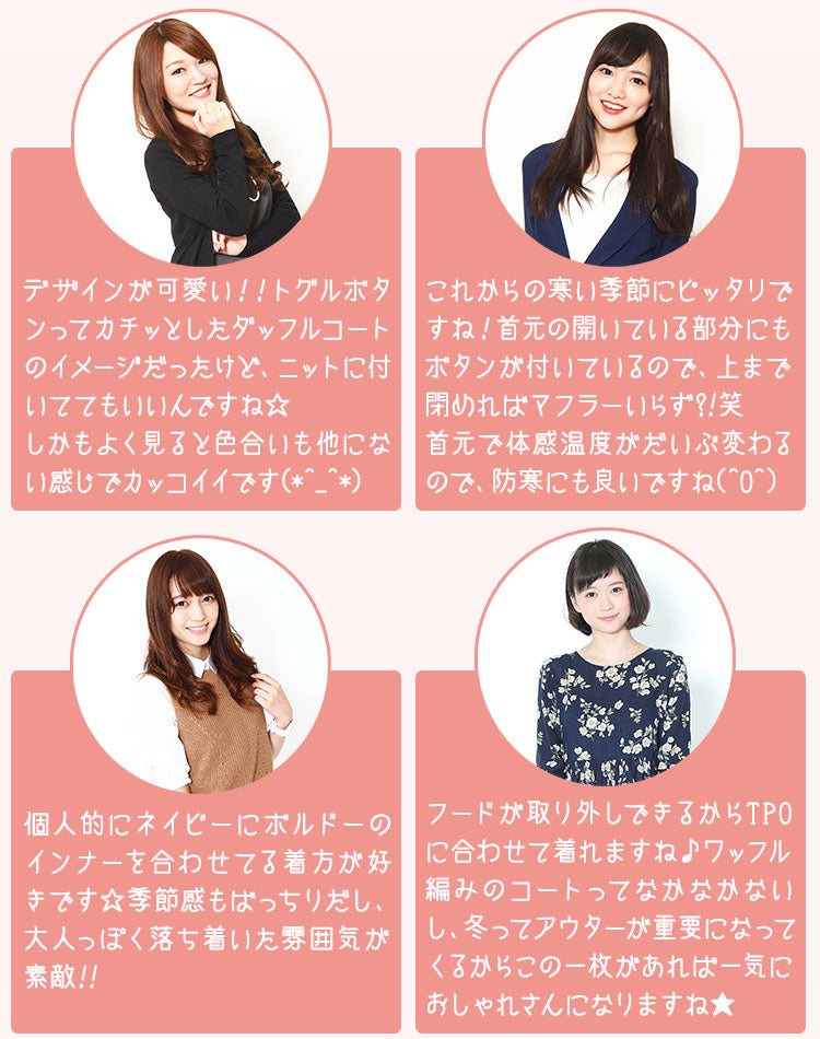 トグルボタンフード着脱ダッフルニットコートの印象をMZガールに聞いてみました!!
