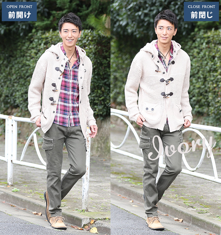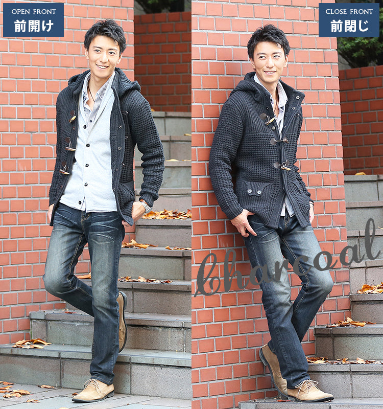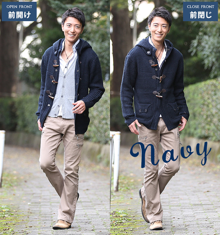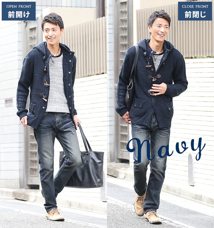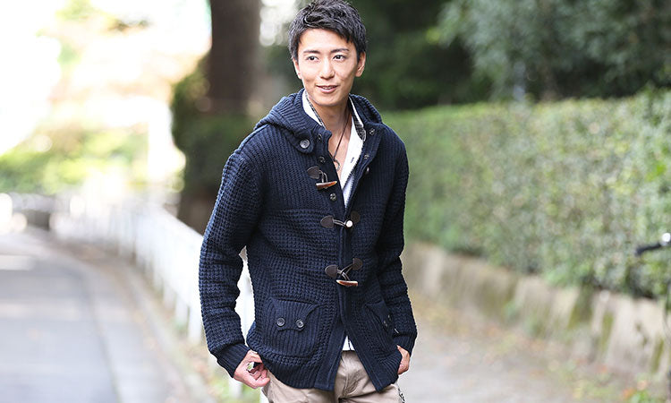 インナーにショールカラーカーディガンを入れる事で男らしくまとめました!ニットコートのトグルボタンがアクセントとなり、シャレ感3割増し!そこにデザインシューズを合わせて品のあるスタイルの完成。