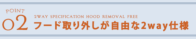 フードがあるかないかで雰囲気が違うのもオシャレの楽しみの一つ。ちょっとカジュアルに魅せる時はフードありで。キレイめな雰囲気を作るときはフードを外してスッキリ魅せる・・などその日の気分やスタイルに合わせてフードを変えることが出来るので1つのアウターで2つの雰囲気を楽しむ事が出来るんです。2WAY仕様なだけで着こなしの幅もググッと広げてくれちゃいますよ!!