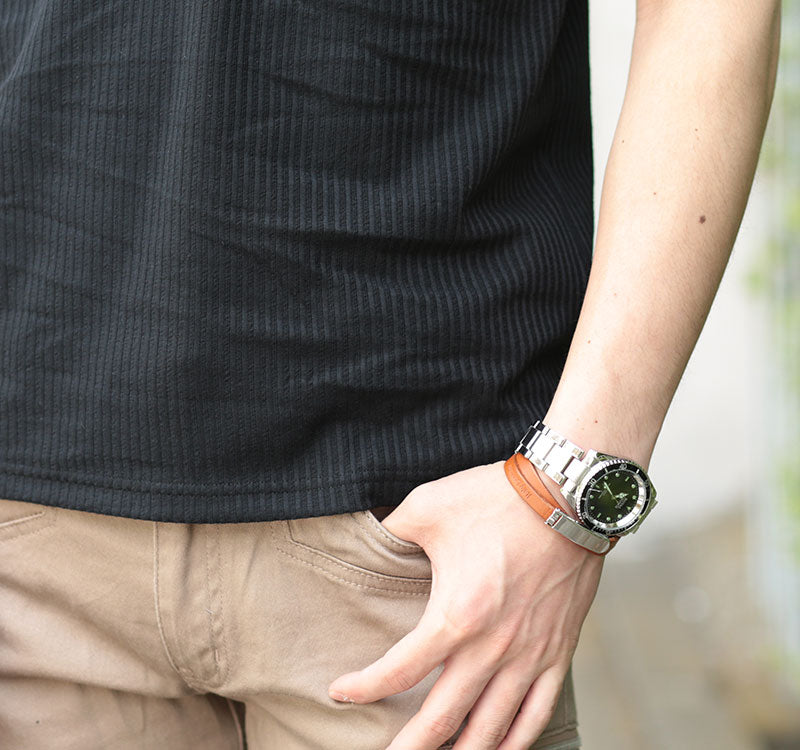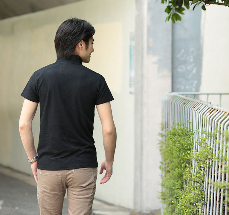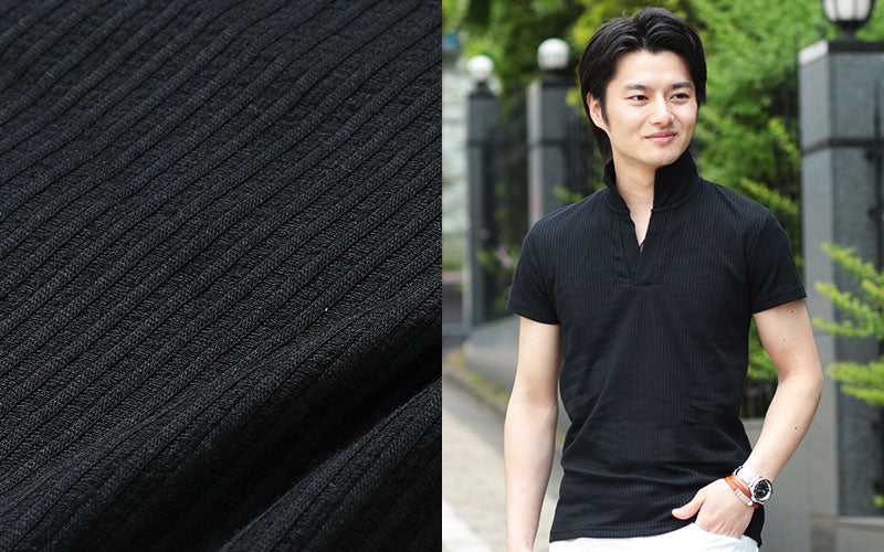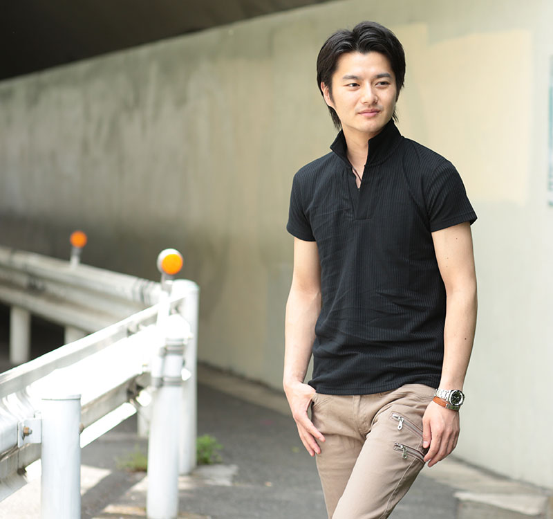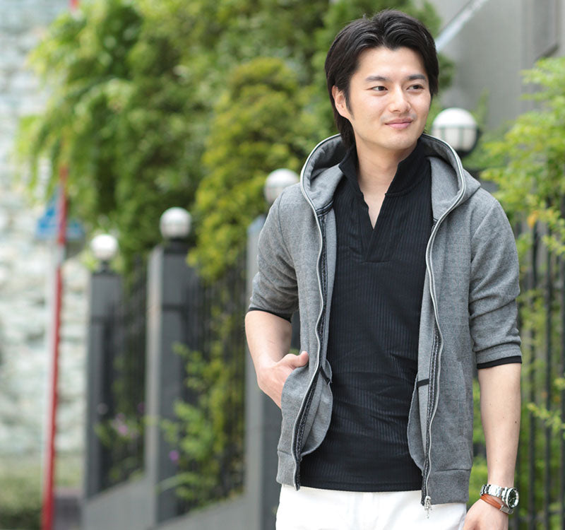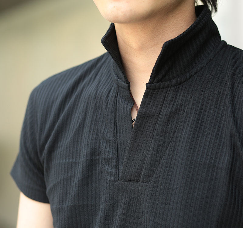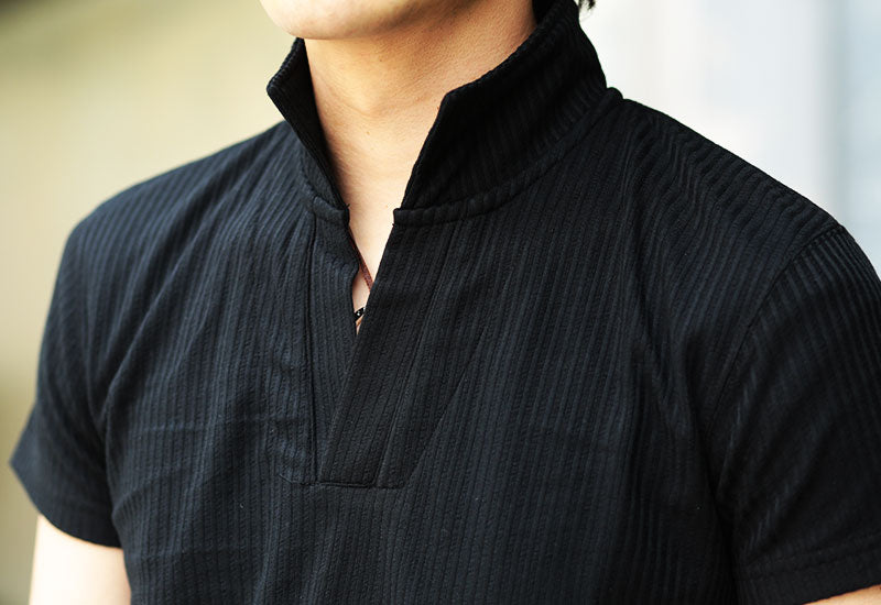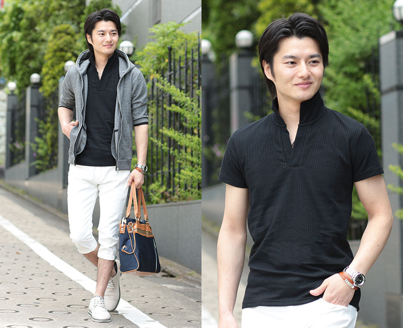 襟を立てて着こなすと男らしさとカッコ良さが3割増しに!首元にボタンがないスキッパーデザインにすることでキレイなVゾーンが作れ大人っぽく着れるポイントとなります!