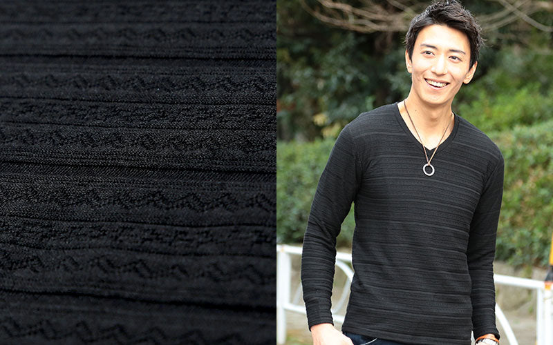 【無地のようで無地じゃないデザインがオシャレ感を3割増しに!!】うっすらジャガードデザインVネック長袖カットソー
