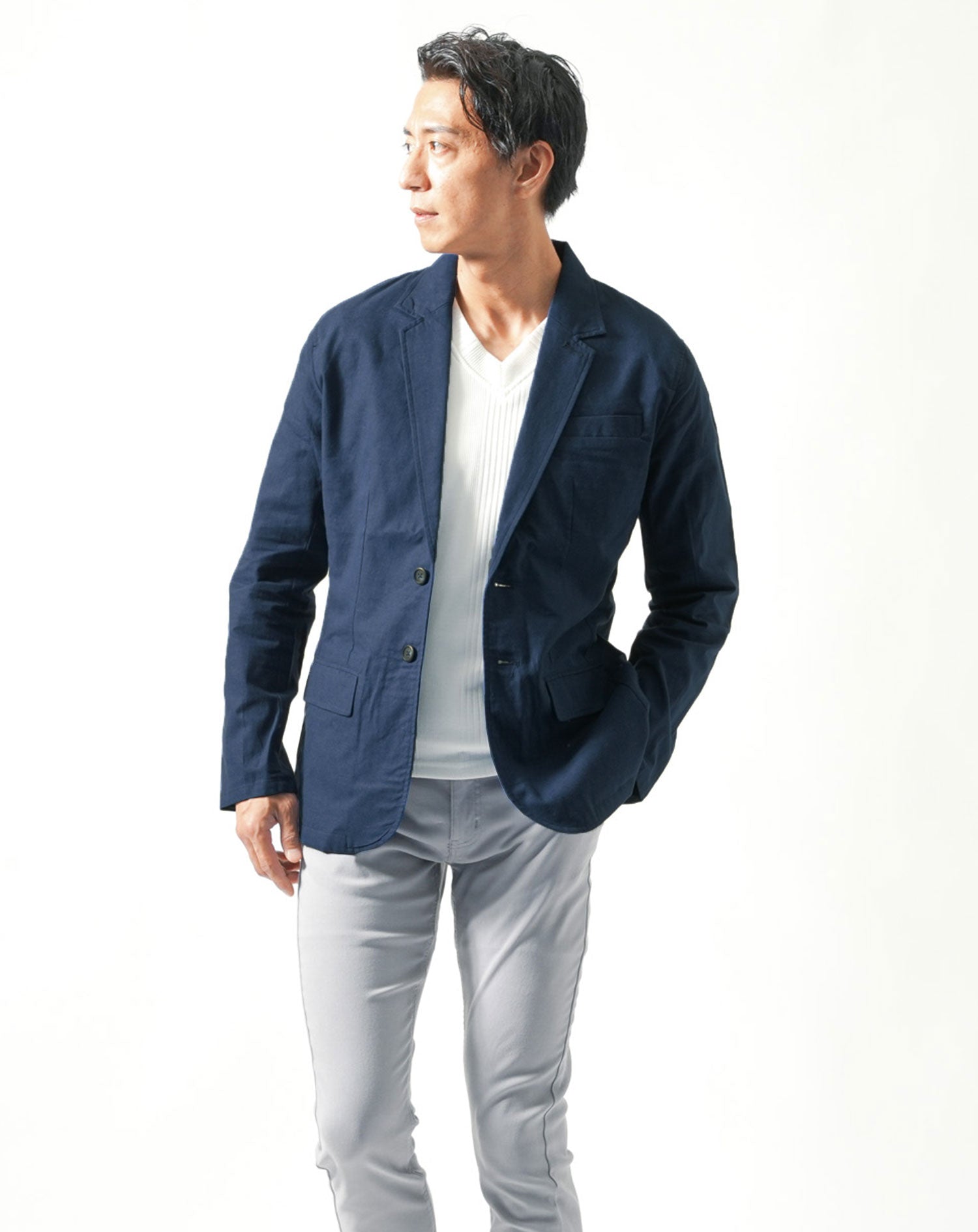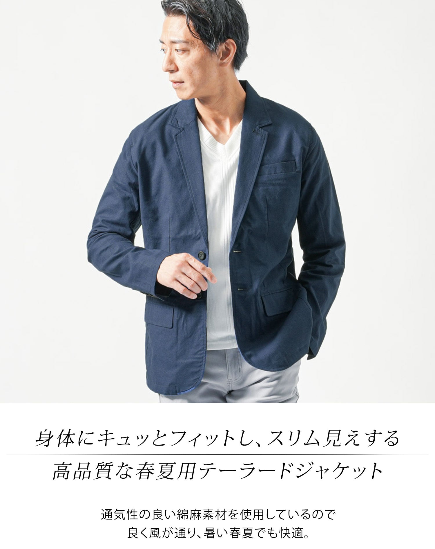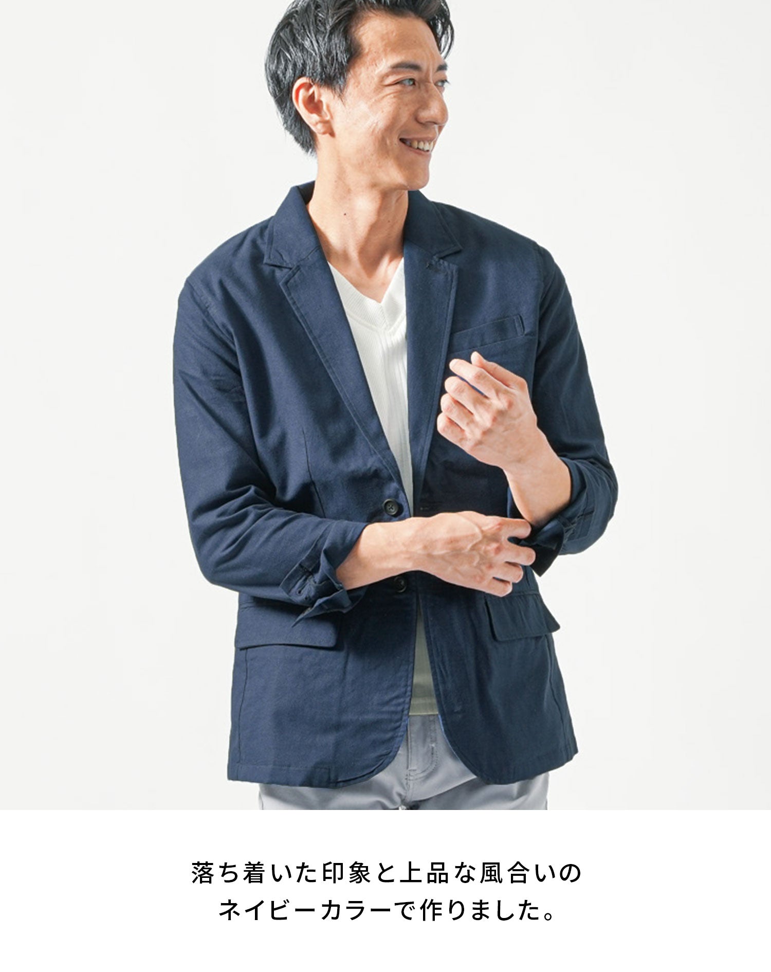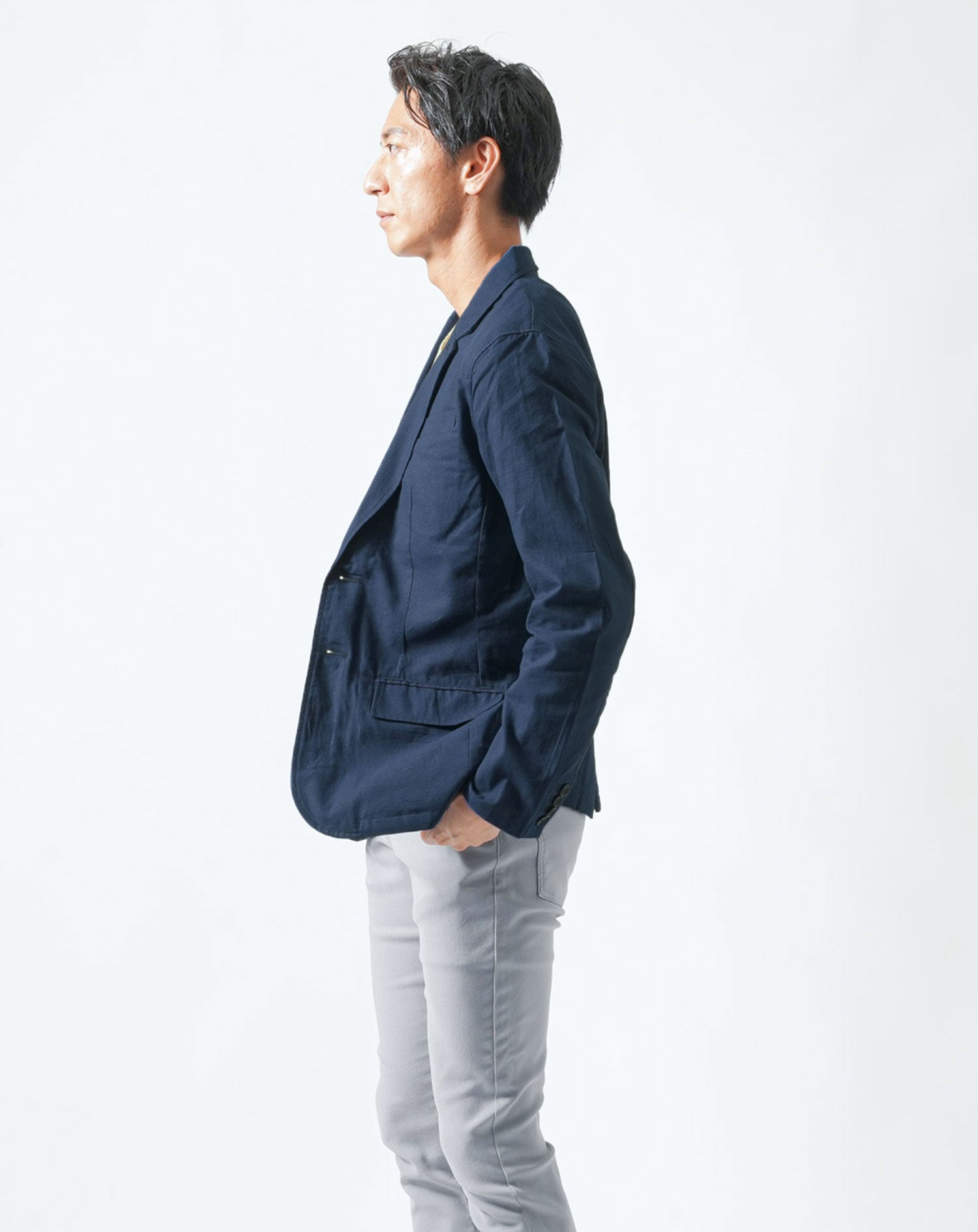 通気性の良い綿麻素材を使用した長袖テーラードジャケットです。 涼しいのはもちろん、綿を配合しているので着心地の良さも魅力です。 薄手生地に加え袖をロールアップして着こなすことで夏のサマージャケットとしても活躍してくれますよ。 スリムな細身シルエットなのでスタイリッシュなコーディネートが完成します。
