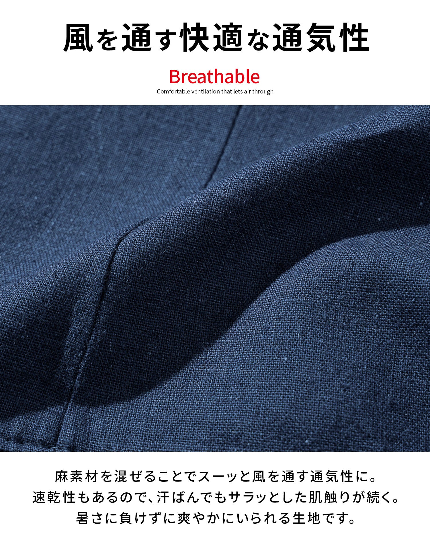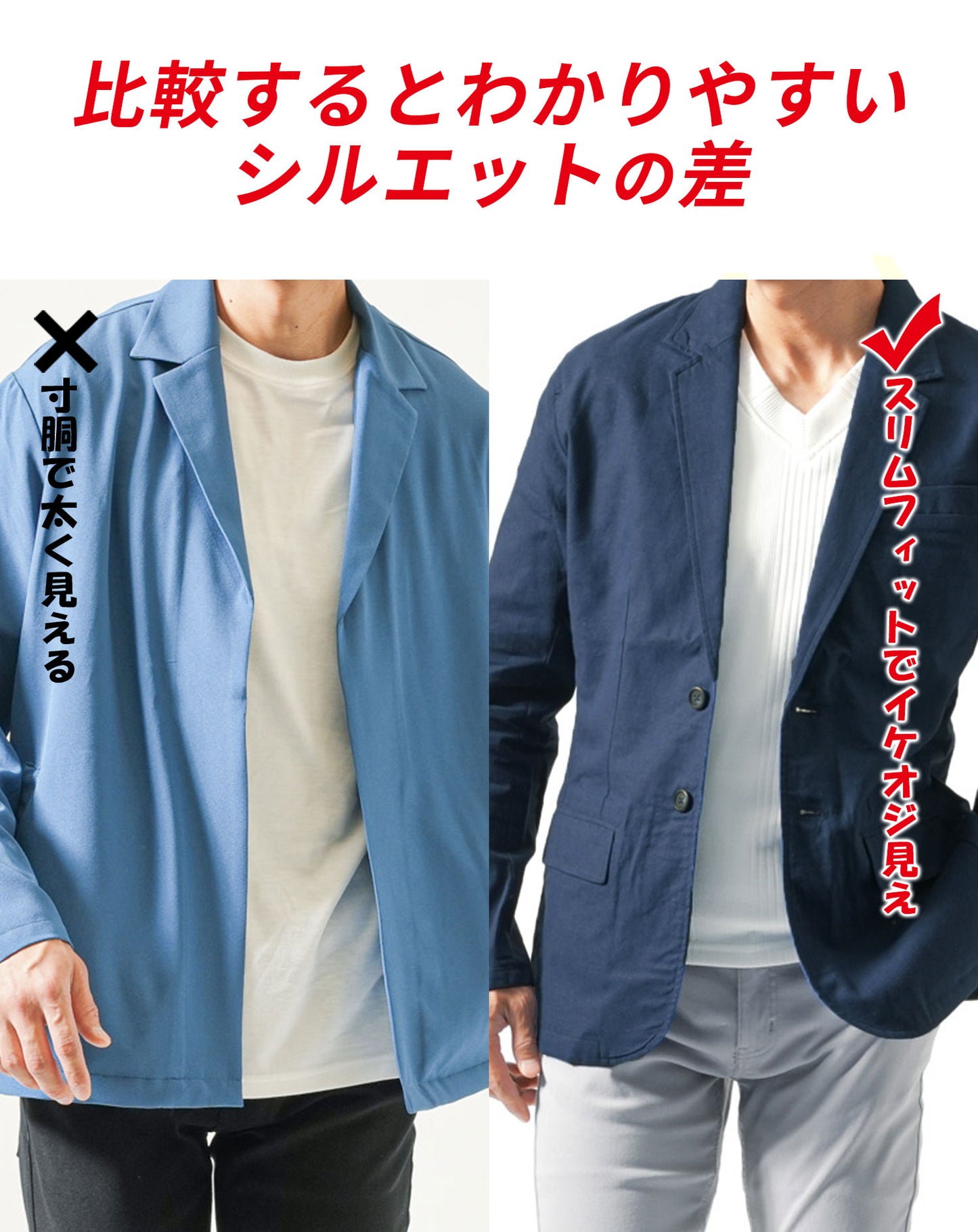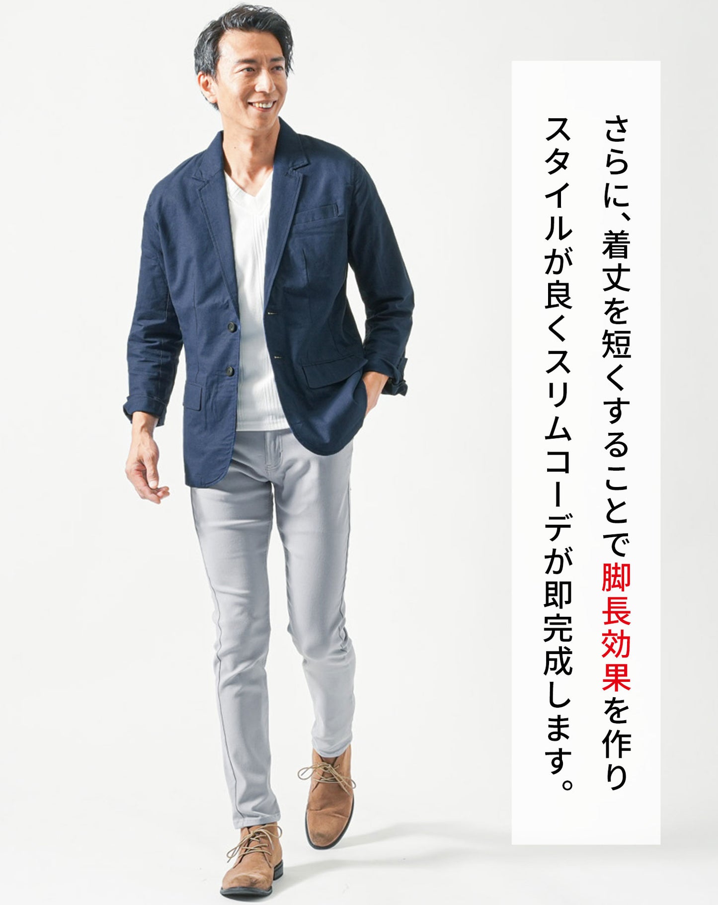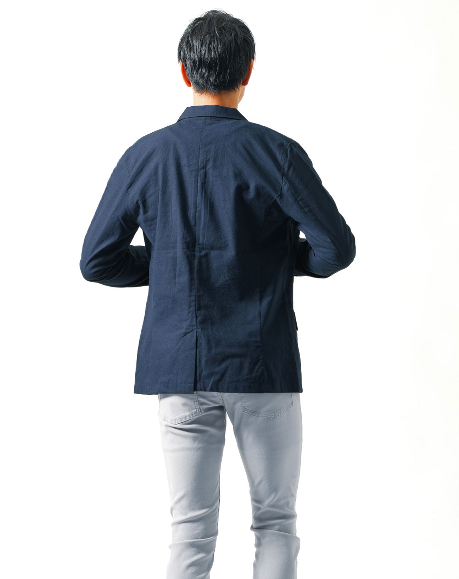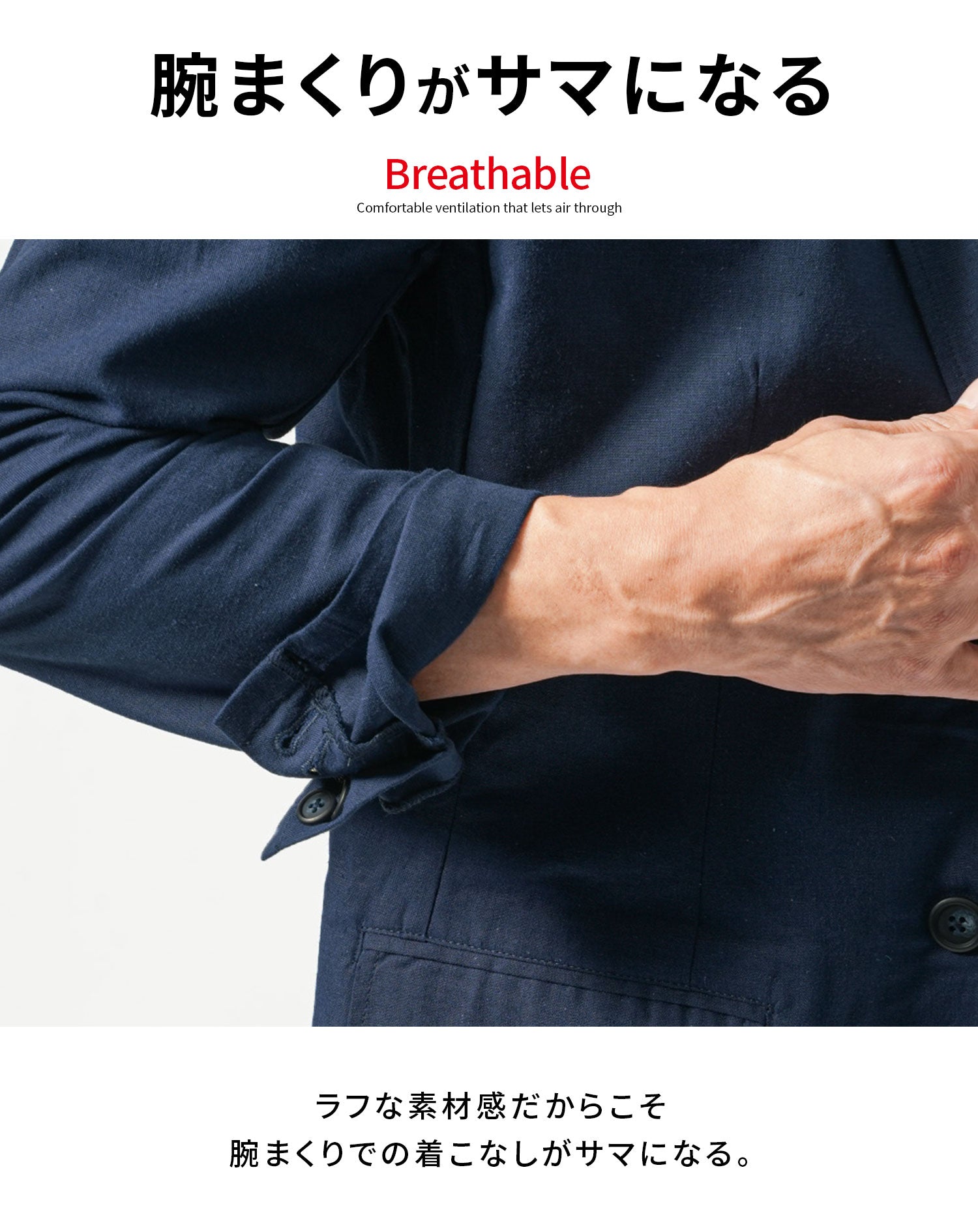 通気性の良い綿麻素材を使用した長袖テーラードジャケットです。 涼しいのはもちろん、綿を配合しているので着心地の良さも魅力です。 薄手生地に加え袖をロールアップして着こなすことで夏のサマージャケットとしても活躍してくれますよ。 スリムな細身シルエットなのでスタイリッシュなコーディネートが完成します。
