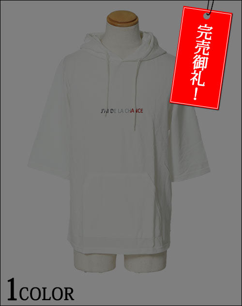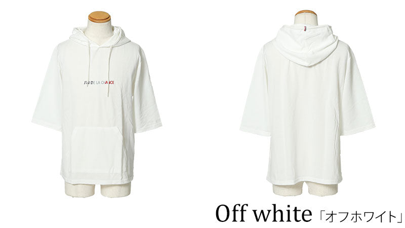5分袖がすずしげでこなれた印象です。フードのセンターにさりげなく3色ラインをオン。