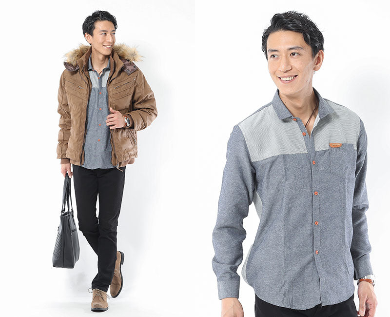 PUレザー使い切り替えデザインシャンブレーシャツ