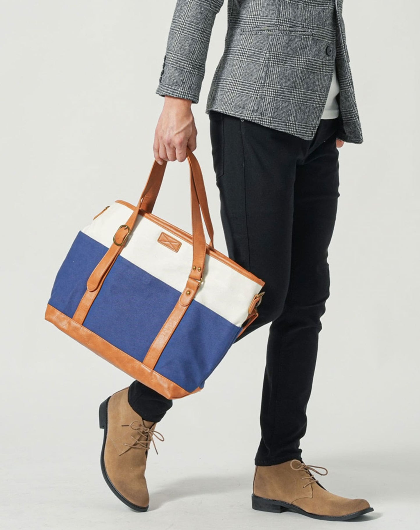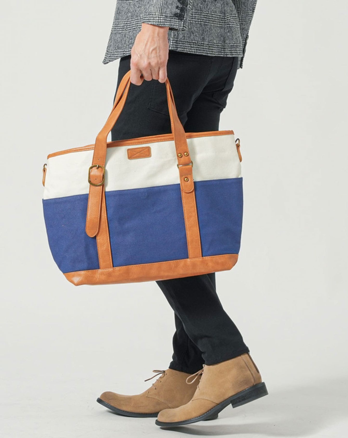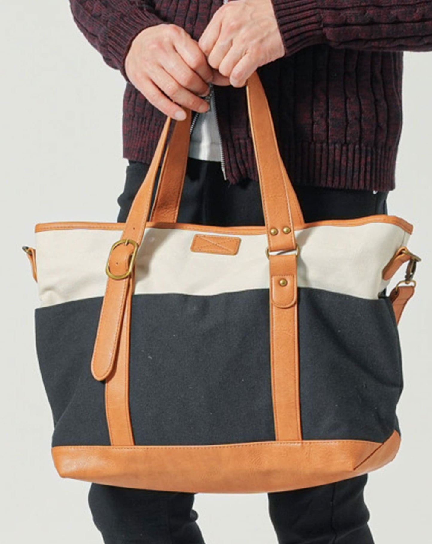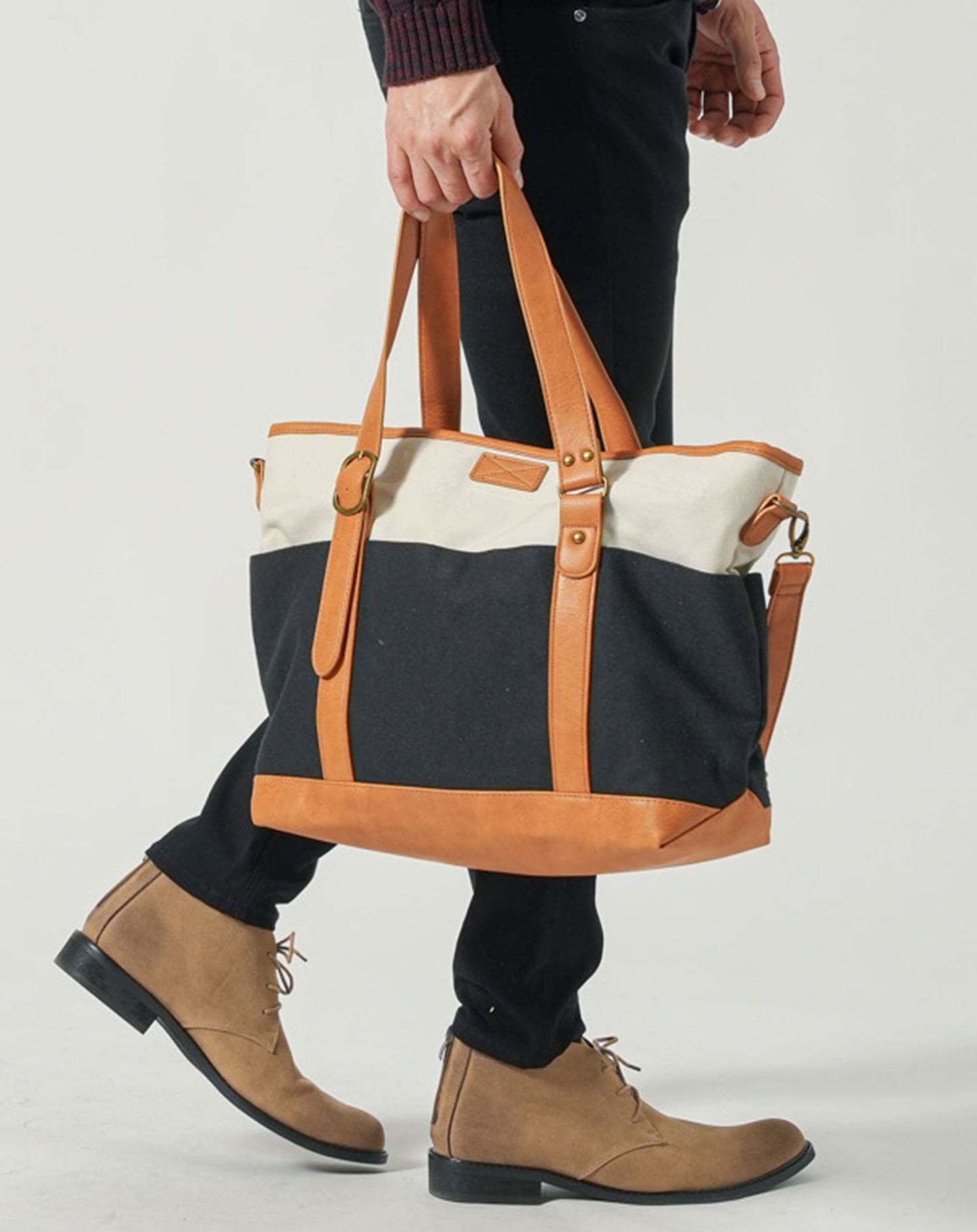 PUレザー×キャンバス切り替えファスナー付きショルダートートバッグは、シンプルながらも存在感を放つ2WAY仕様のデザインが魅力です。厚みのあるコットンキャンバスと柔らかなPUレザーの切り替えによって、上質感と耐久性を両立しており、日常使いや旅行に最適な大容量を誇ります。特に、型崩れしにくい仕様と調整可能なハンドルにより、肩掛けや斜め掛けのスタイルでも快適に使用できる点が利点です。休日のカジュアルスタイルや街中でのビジネスカジュアルにも違和感なくフィットし、シンプルな配色はどんなコーディネートとも調和します。外側の差し込みポケットや内側のファスナーポケット、小物収納ポケットも充実しており、日々の必需品を整理整頓して持ち運ぶことができるのも嬉しいポイントです。おしゃれで機能的なこのバッグは、スタイリッシュな30?50代男性にとって、必携のアイテムと言えるでしょう。