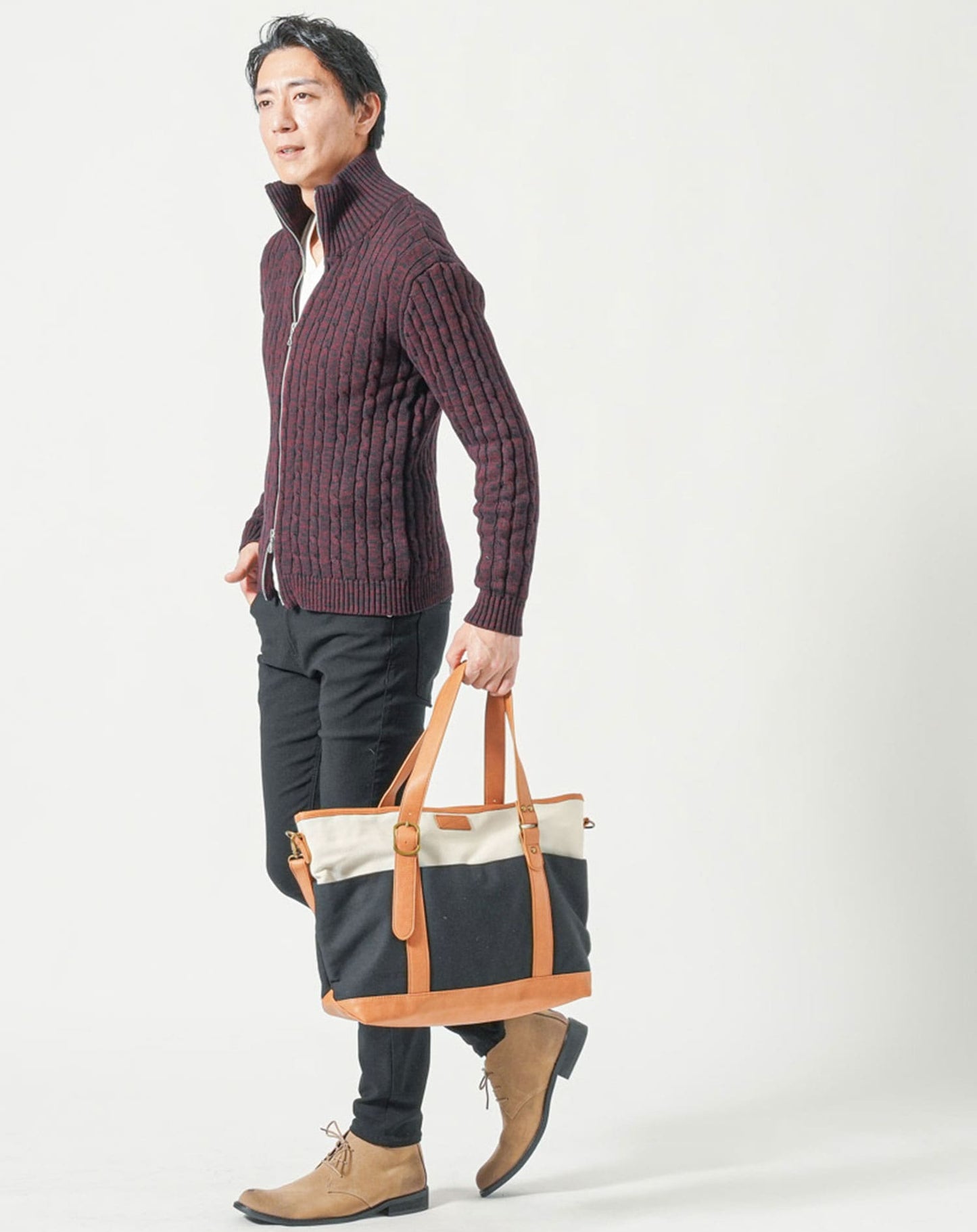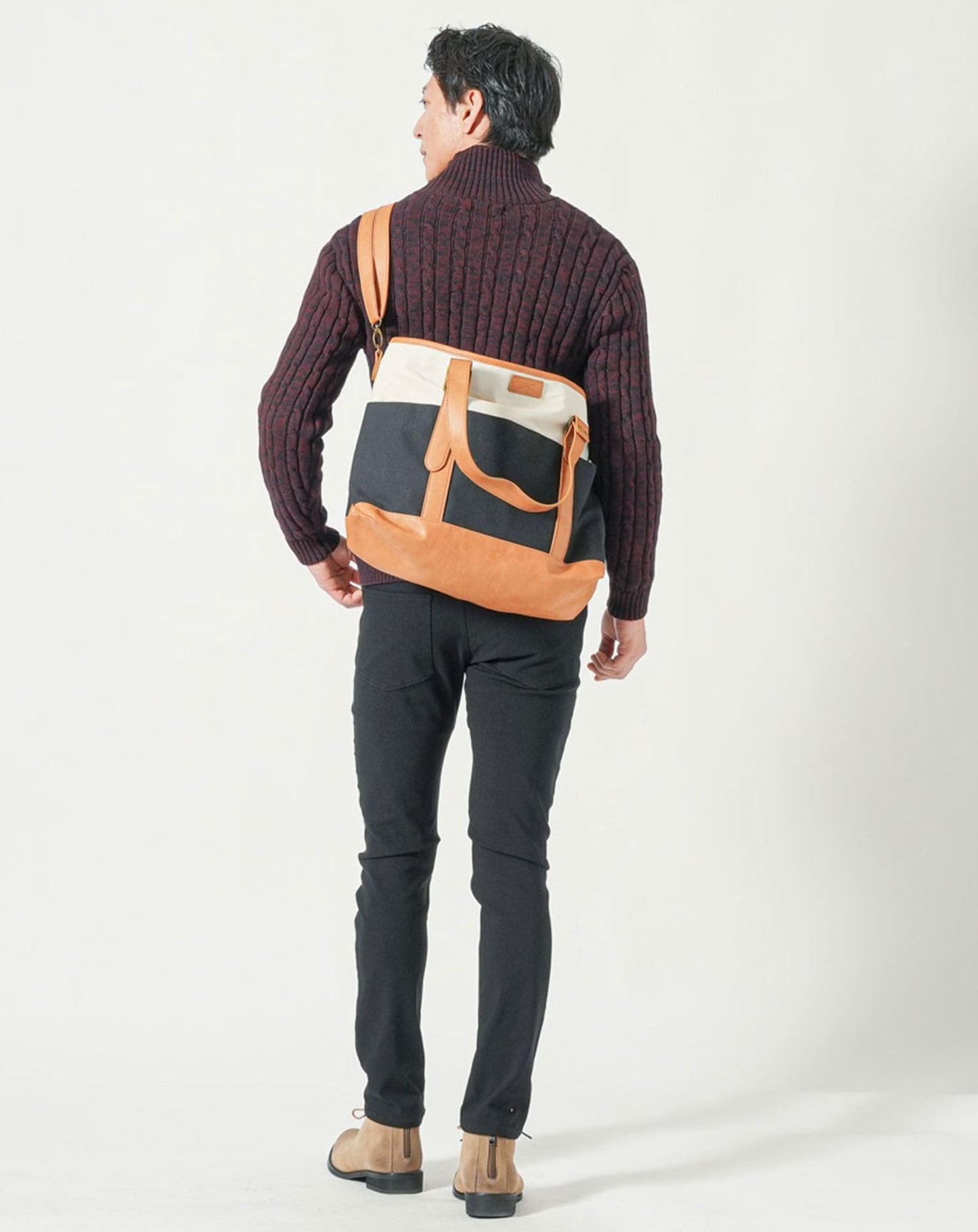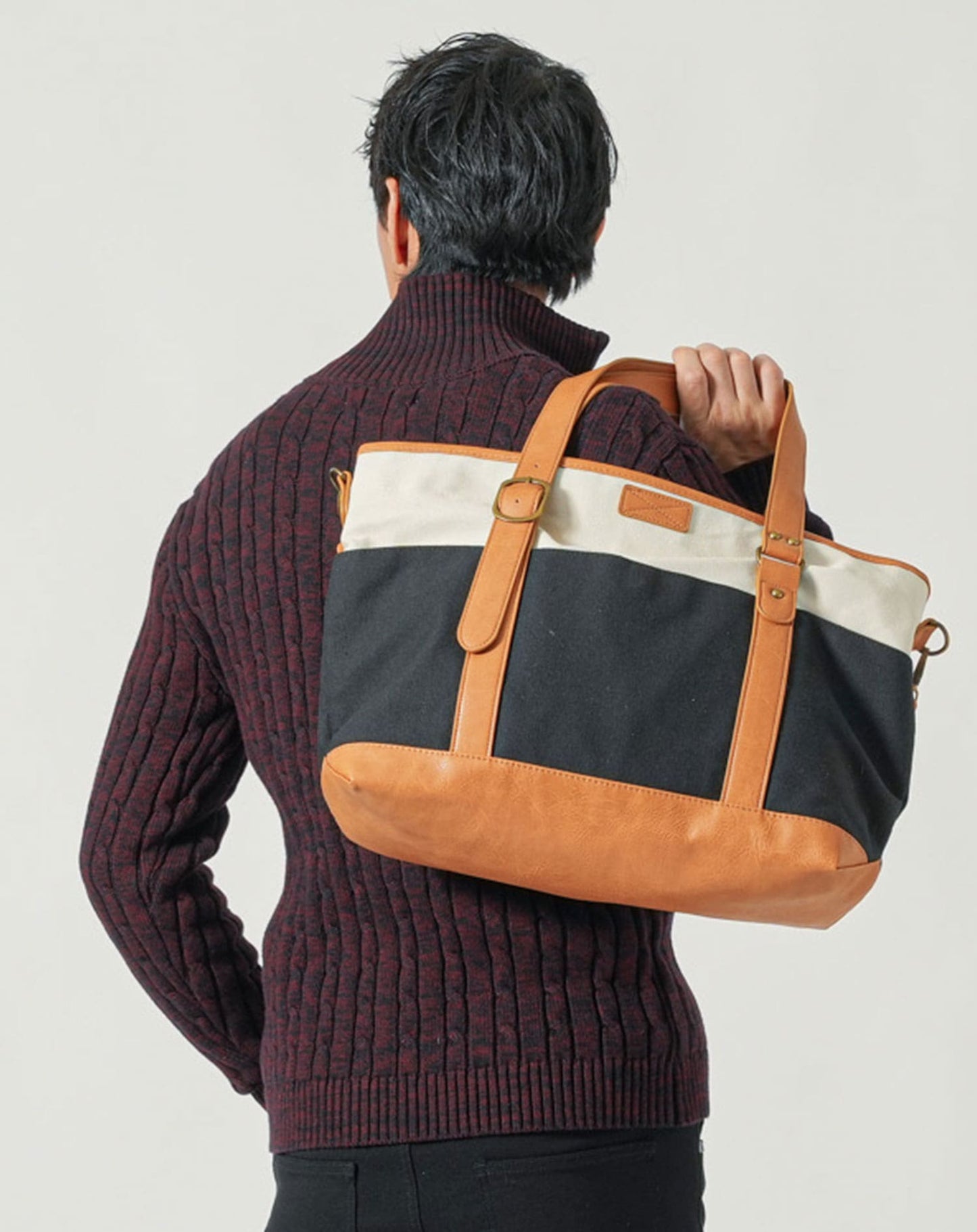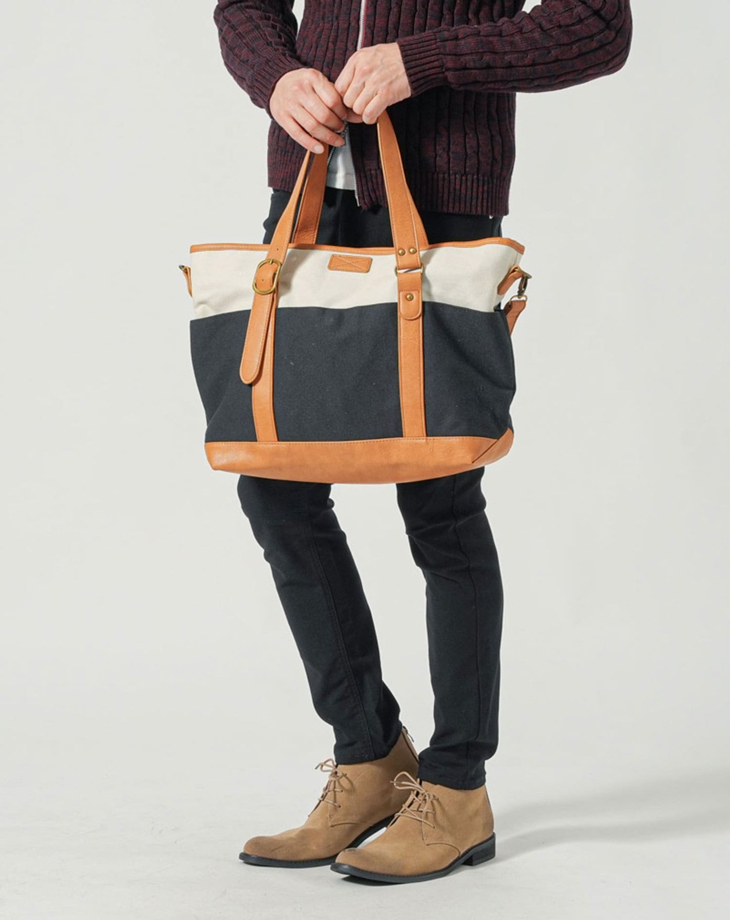 PUレザー×キャンバス切り替えファスナー付きショルダートートバッグは、シンプルながらも存在感を放つ2WAY仕様のデザインが魅力です。厚みのあるコットンキャンバスと柔らかなPUレザーの切り替えによって、上質感と耐久性を両立しており、日常使いや旅行に最適な大容量を誇ります。特に、型崩れしにくい仕様と調整可能なハンドルにより、肩掛けや斜め掛けのスタイルでも快適に使用できる点が利点です。休日のカジュアルスタイルや街中でのビジネスカジュアルにも違和感なくフィットし、シンプルな配色はどんなコーディネートとも調和します。外側の差し込みポケットや内側のファスナーポケット、小物収納ポケットも充実しており、日々の必需品を整理整頓して持ち運ぶことができるのも嬉しいポイントです。おしゃれで機能的なこのバッグは、スタイリッシュな30?50代男性にとって、必携のアイテムと言えるでしょう。