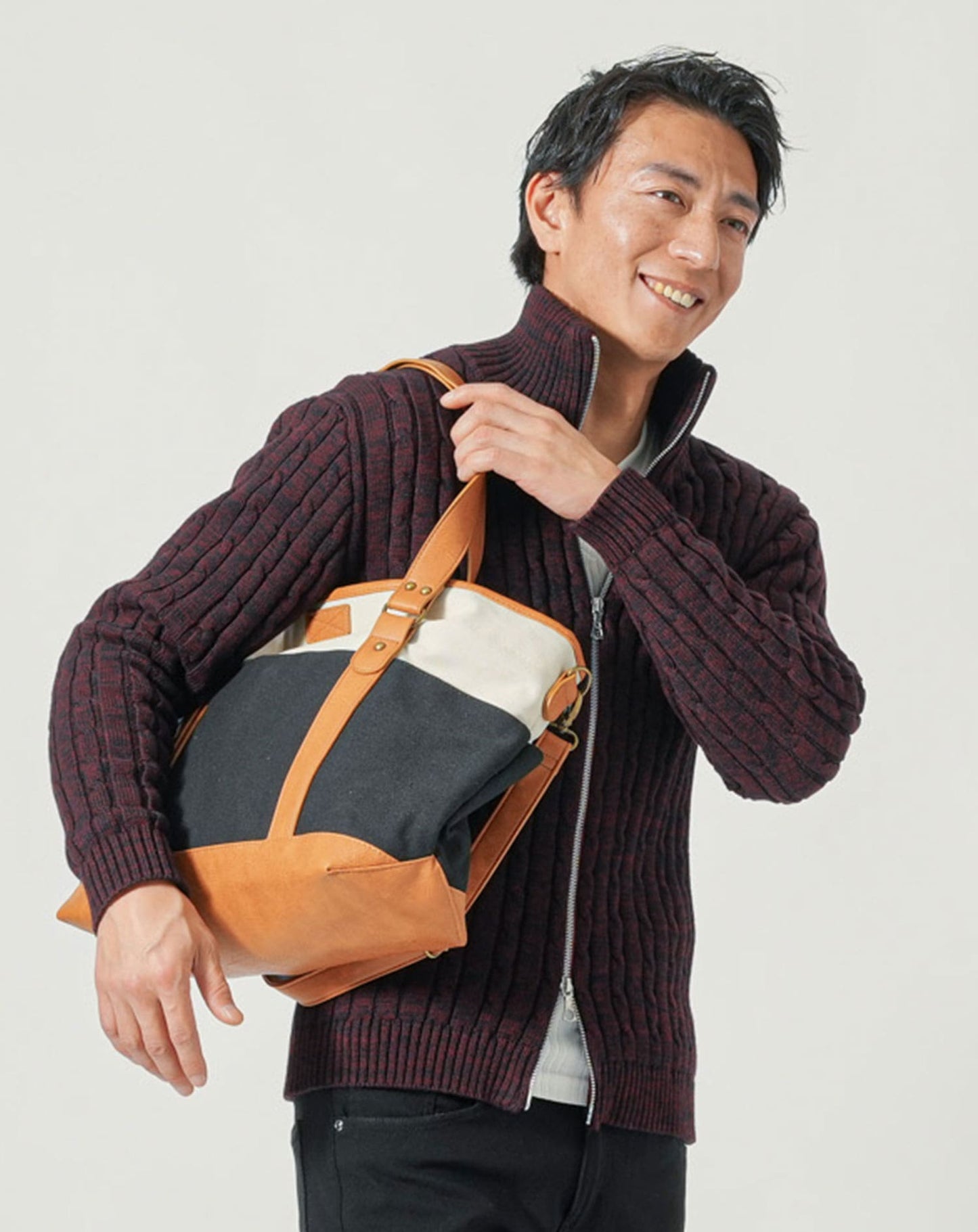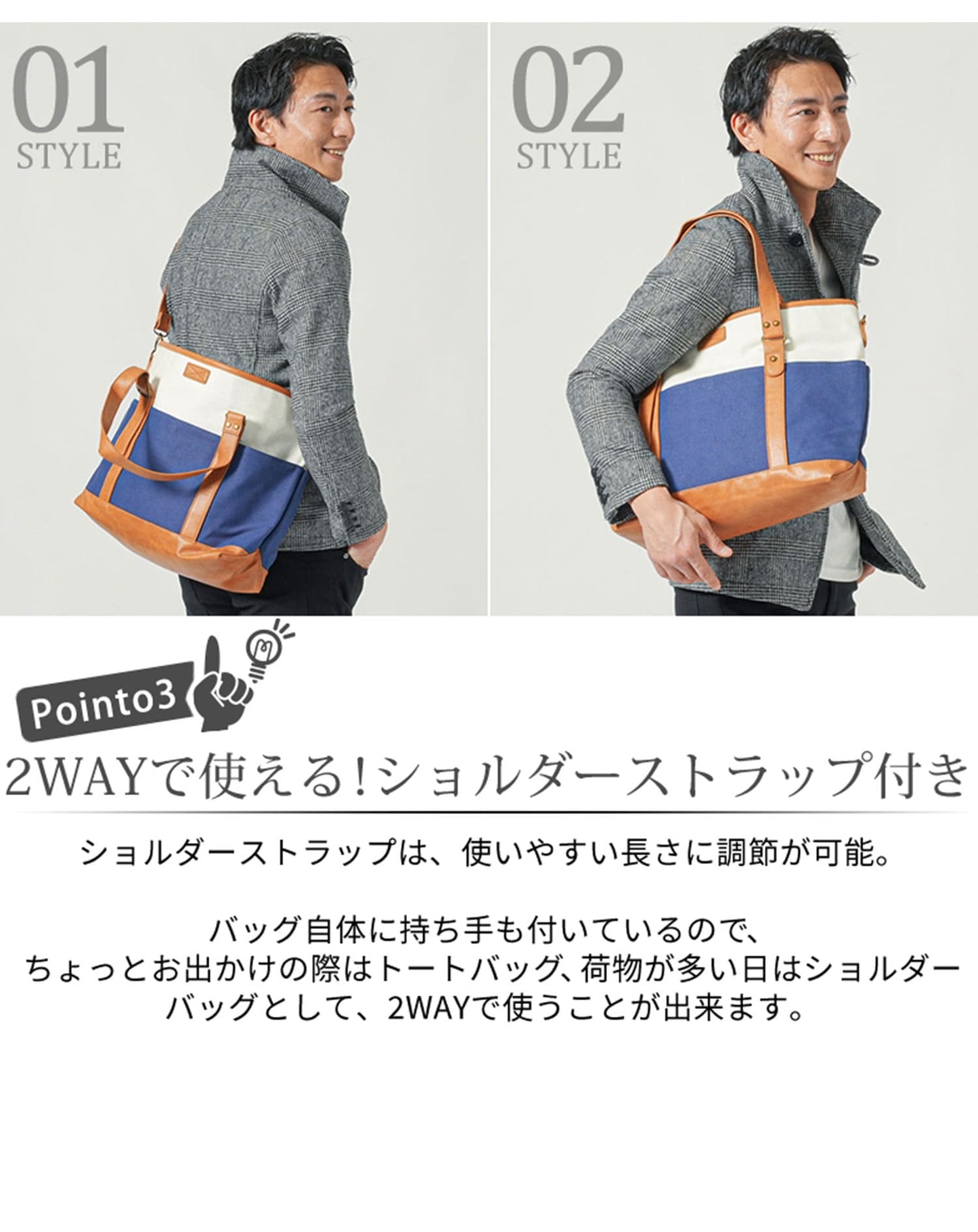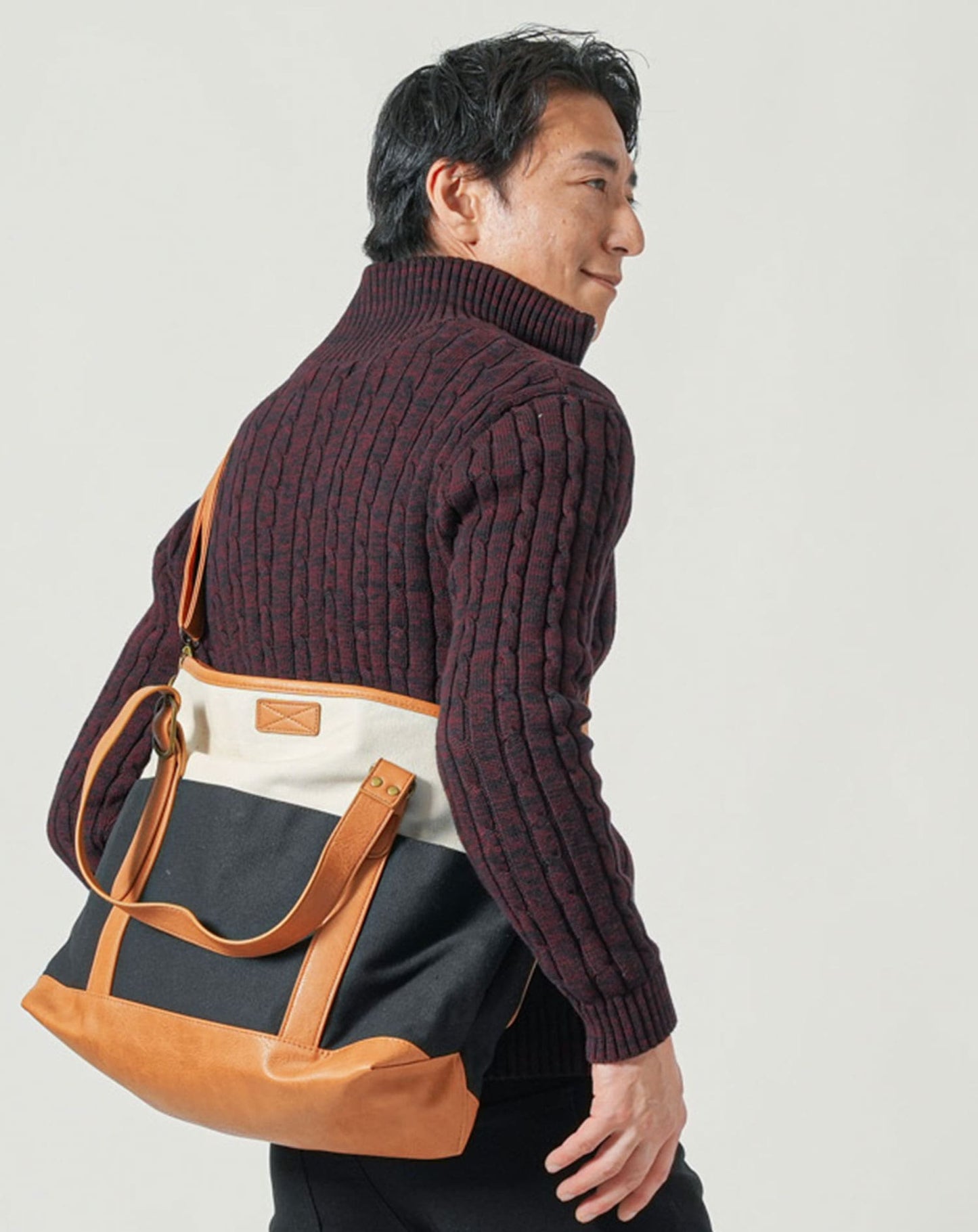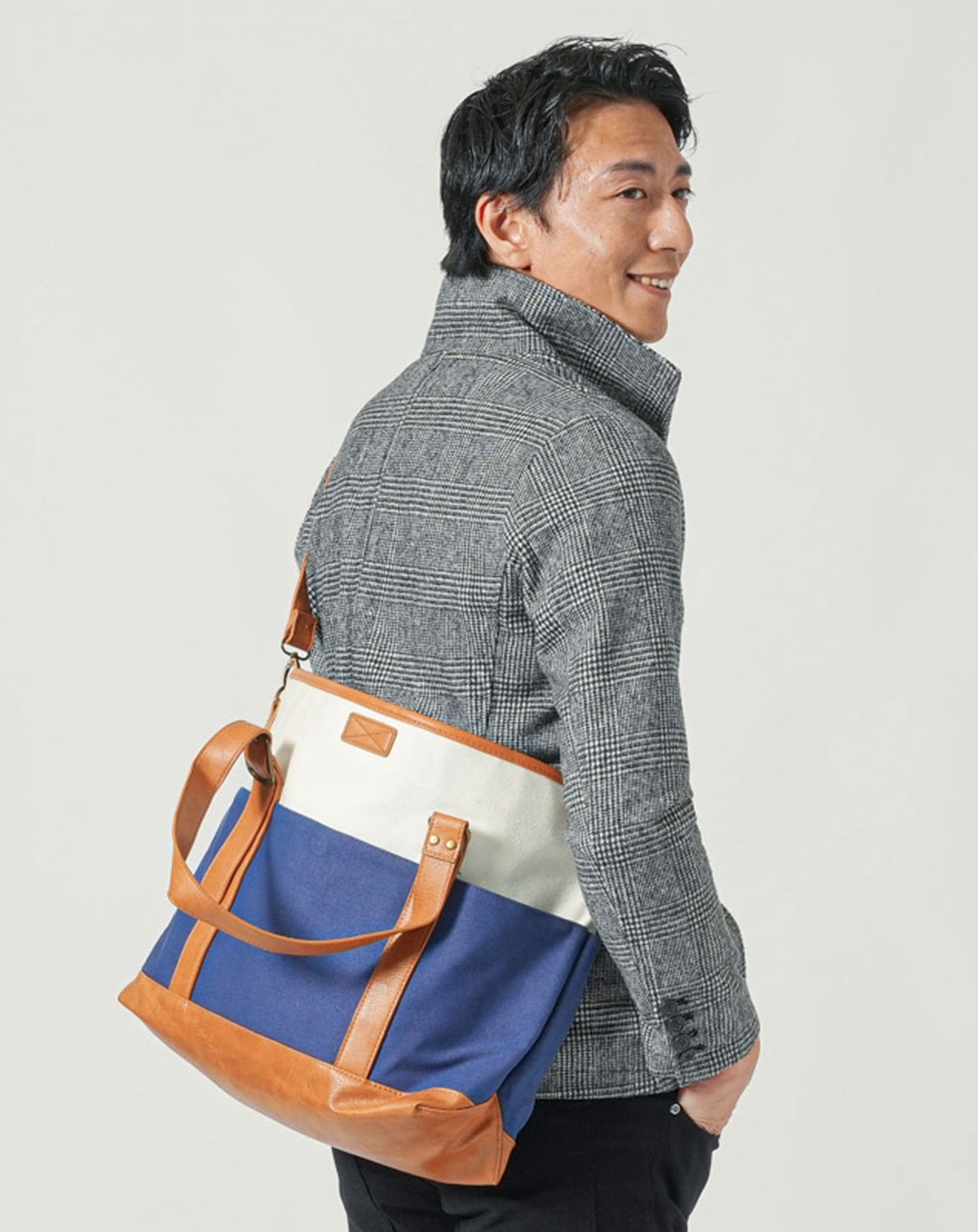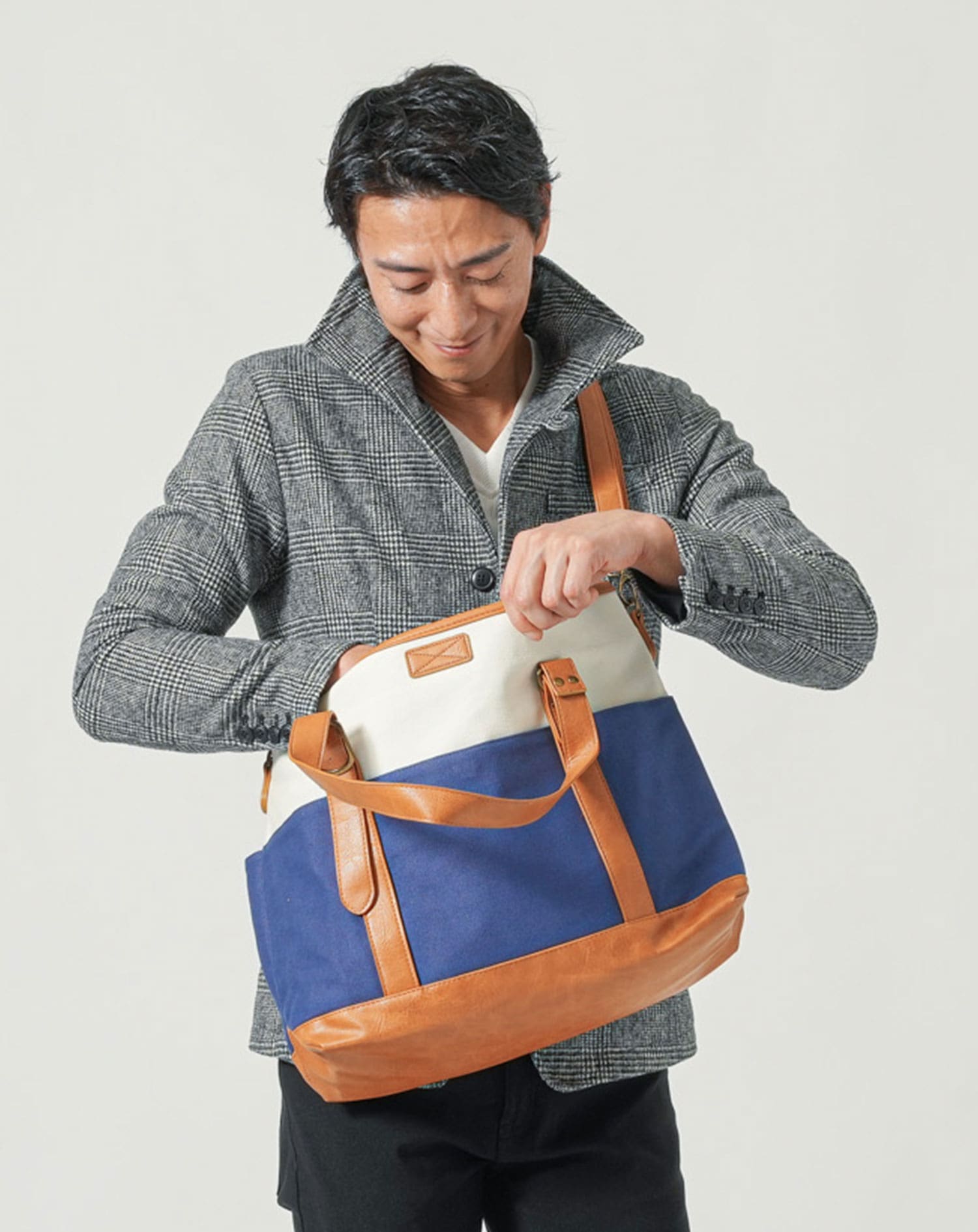 PUレザー×キャンバス切り替えファスナー付きショルダートートバッグは、シンプルながらも存在感を放つ2WAY仕様のデザインが魅力です。厚みのあるコットンキャンバスと柔らかなPUレザーの切り替えによって、上質感と耐久性を両立しており、日常使いや旅行に最適な大容量を誇ります。特に、型崩れしにくい仕様と調整可能なハンドルにより、肩掛けや斜め掛けのスタイルでも快適に使用できる点が利点です。休日のカジュアルスタイルや街中でのビジネスカジュアルにも違和感なくフィットし、シンプルな配色はどんなコーディネートとも調和します。外側の差し込みポケットや内側のファスナーポケット、小物収納ポケットも充実しており、日々の必需品を整理整頓して持ち運ぶことができるのも嬉しいポイントです。おしゃれで機能的なこのバッグは、スタイリッシュな30?50代男性にとって、必携のアイテムと言えるでしょう。