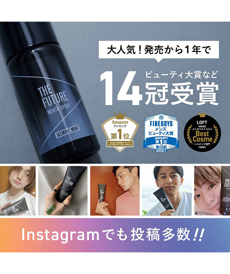 THEFUTURE(ザフューチャー)のミントマウスウォッシュスプレーは、日本製の高品質な口臭ケアアイテムです。内容量は20mlで、持ち運びやすいコンパクトサイズが特徴。コスメ14冠を受賞した実績があり、業界内でも注目されています。その効果は、口内のすみずみまでアプローチができる有効成分を配合し、口臭をしっかりと防ぎながら、爽やかな息を長時間キープします。特に、乾燥によるニオイリスクを軽減するホエイ成分や、茶エキス、メントールを活用しているため、口の中をうるおしながら清涼感を提供します。