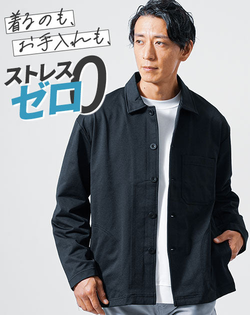 シンプルながらも機能性に優れたカバーオールジャケットです。 身体の動きに合わせて縦にも横にも伸びるストレッチ素材なので動きやすくストレスフリーな着心地を味わうことが出来ます。 さらに汗を乾かしてくれるドライ加工にもなっており春や秋に最適な1枚です。 ご家庭の洗濯機でも洗えてシワににもなりにくいので、お手入れのストレスも0なアウターとなっております。 ややゆったりめのシルエットなので細身の方はもちろん、ガッチリ体型の方にもおすすめ。 シンプルな無地ジャケットなので着回しも効いてとても便利です。