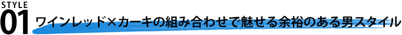 トップスにはカーキ色のボトムスと相性抜群のワインレッドのカラーをチョイスし、