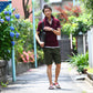 カーゴパンツのワイルドさとポロシャツのキレイめ感が絶妙にマッチし、