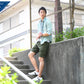 ちょうど膝上になるように計算してロールアップされたこのカーゴパンツはまさしく、