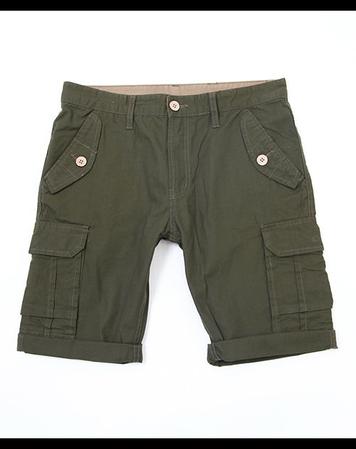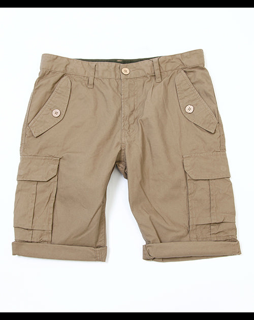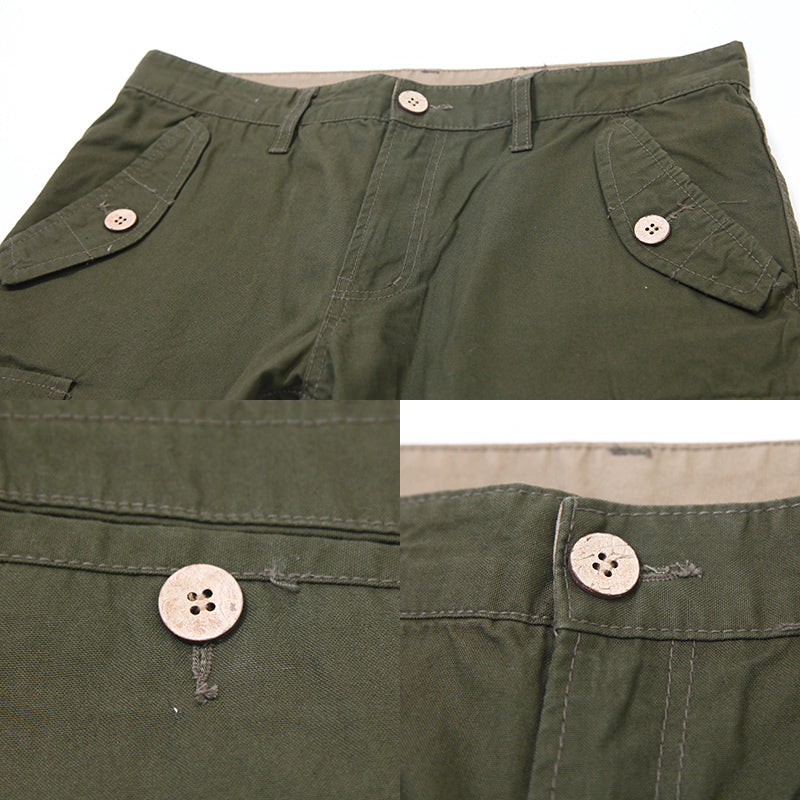カーゴパンツデザインに相性抜群の、ベージュのウッドボタンを採用!