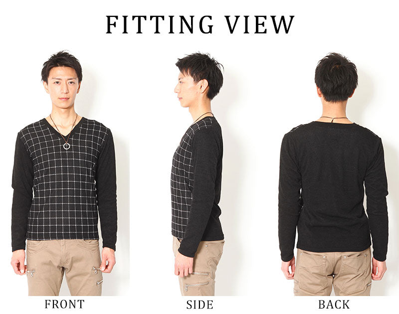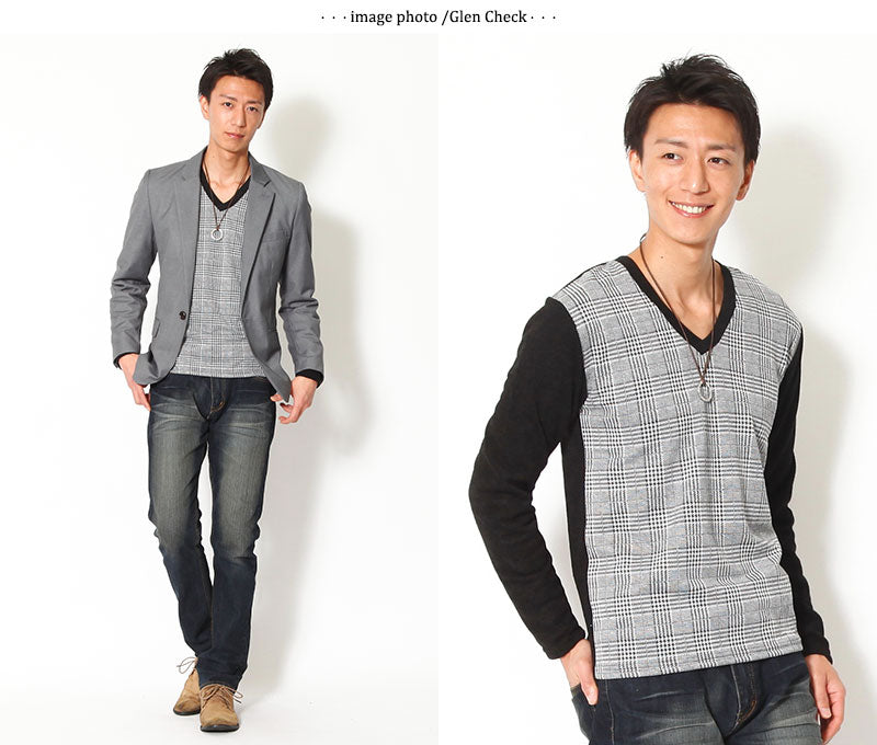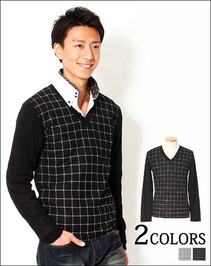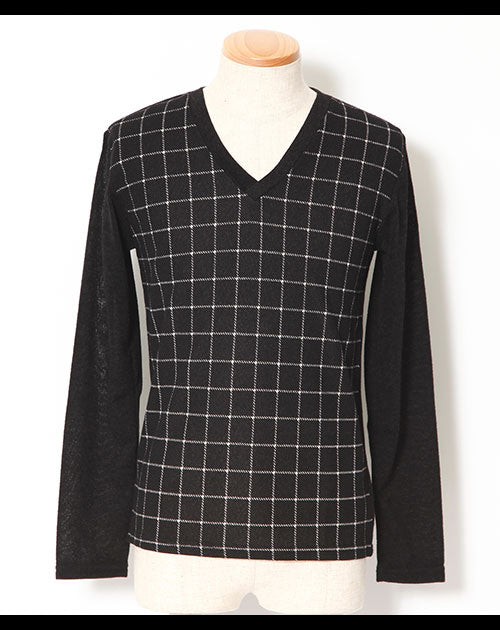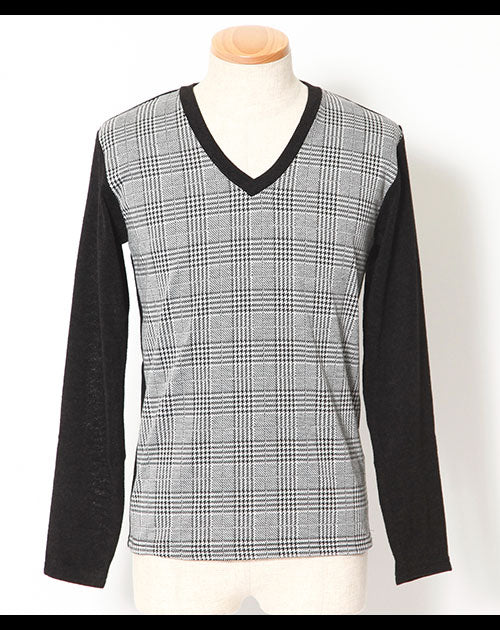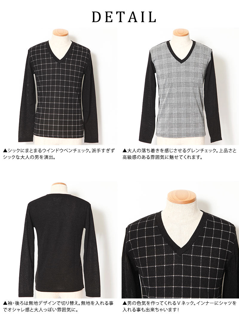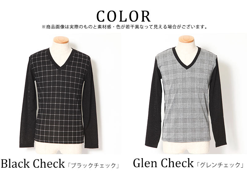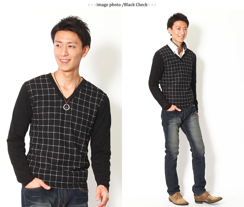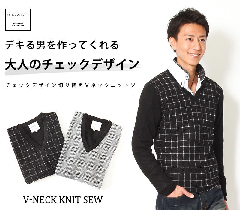 【デキる男を作ってくれる大人のチェックデザイン】チェックデザイン切り替えVネックニットソー