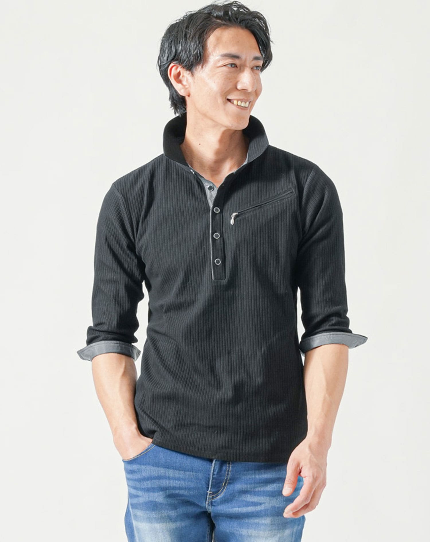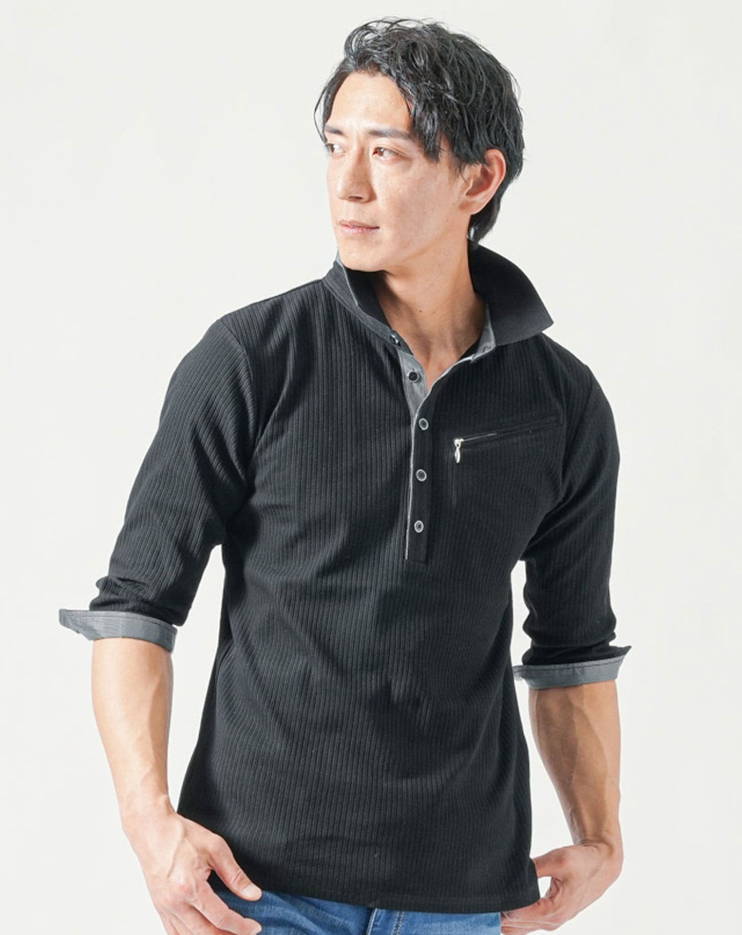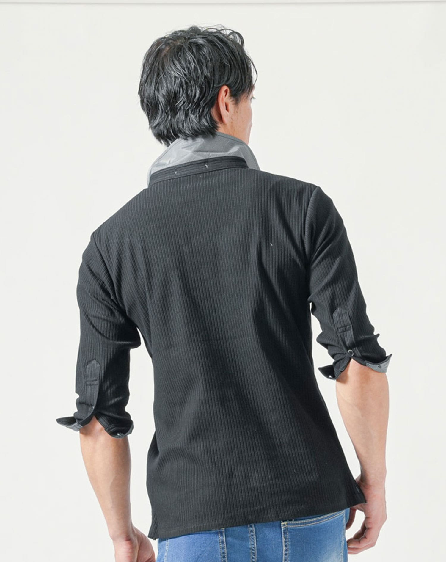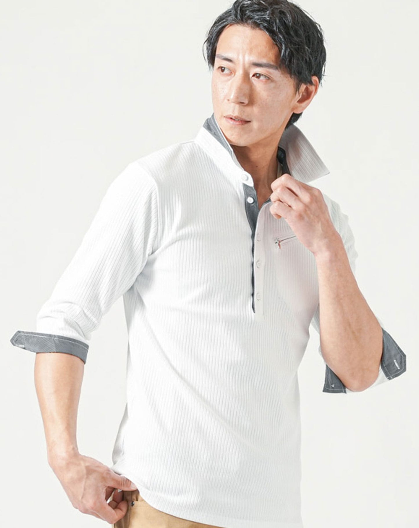 涼しい接触冷感前立てデザインランダムテレコ7分袖ポロシャツ
