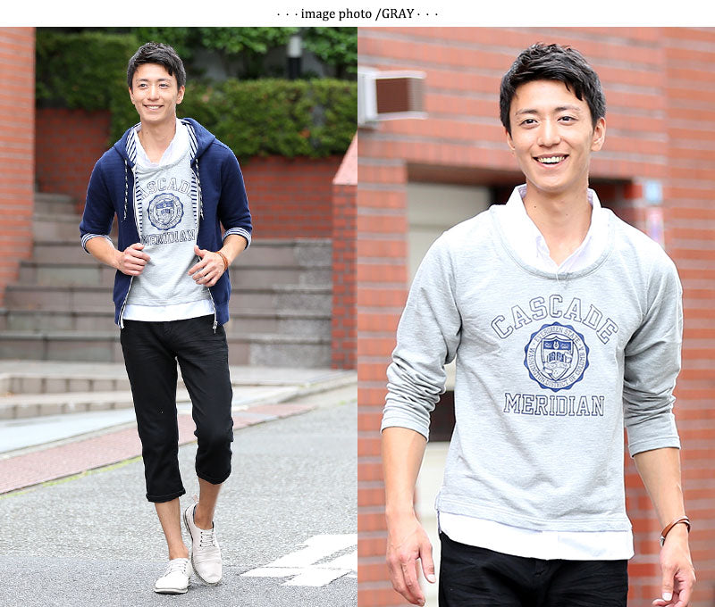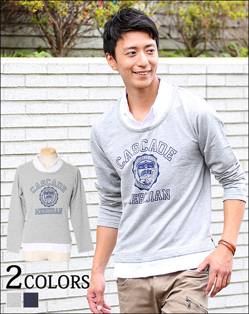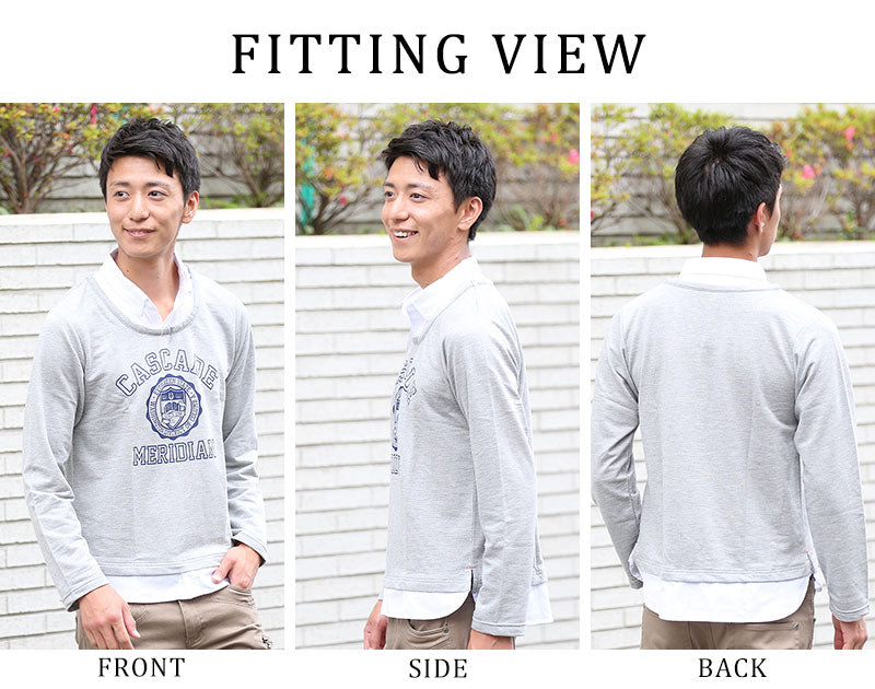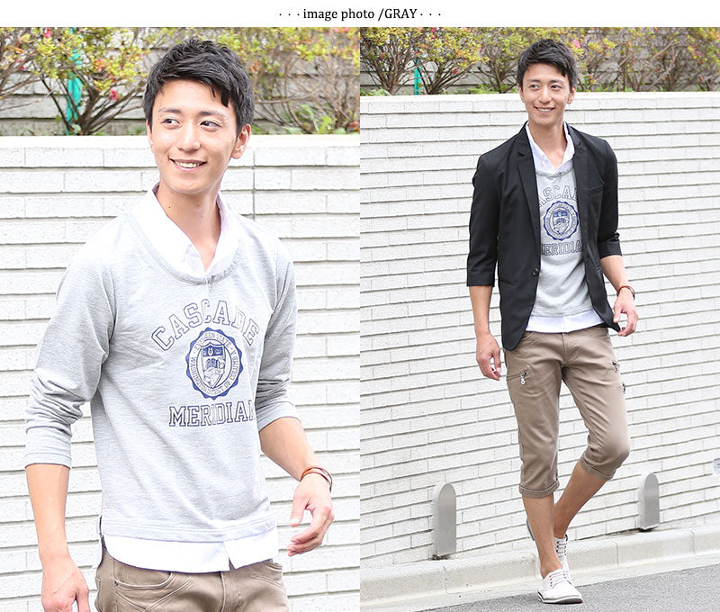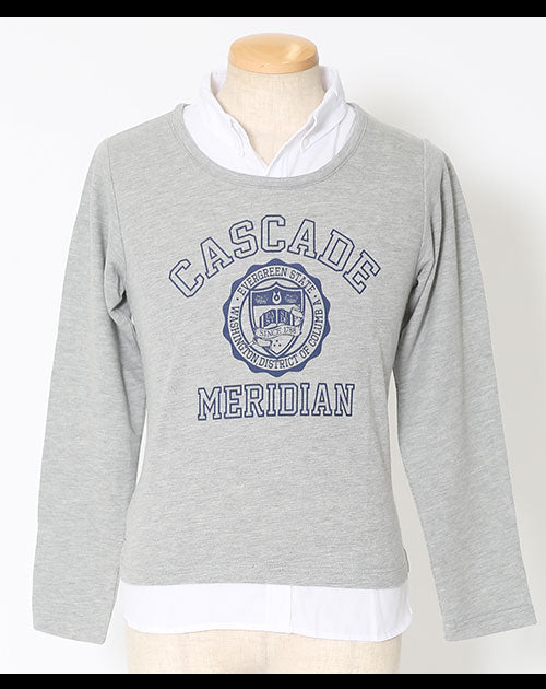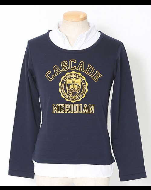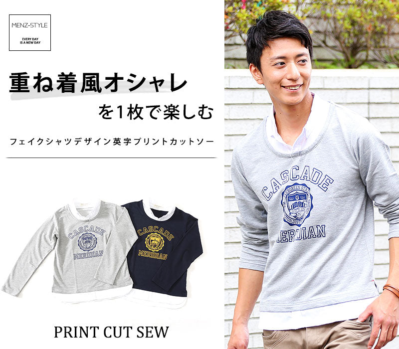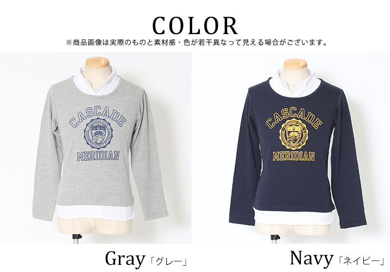 【重ね着風オシャレを1枚で楽しむ♪】フェイクシャツデザイン英字プリントカットソー
