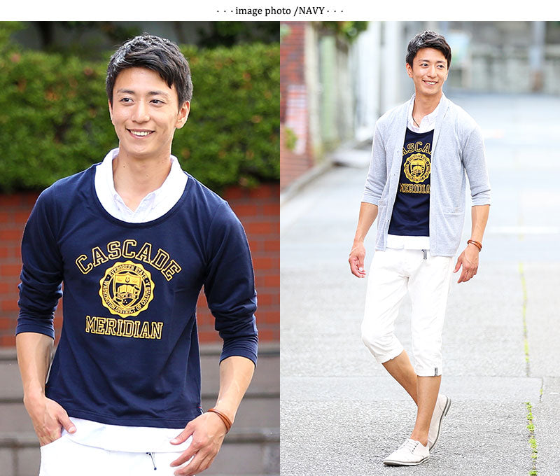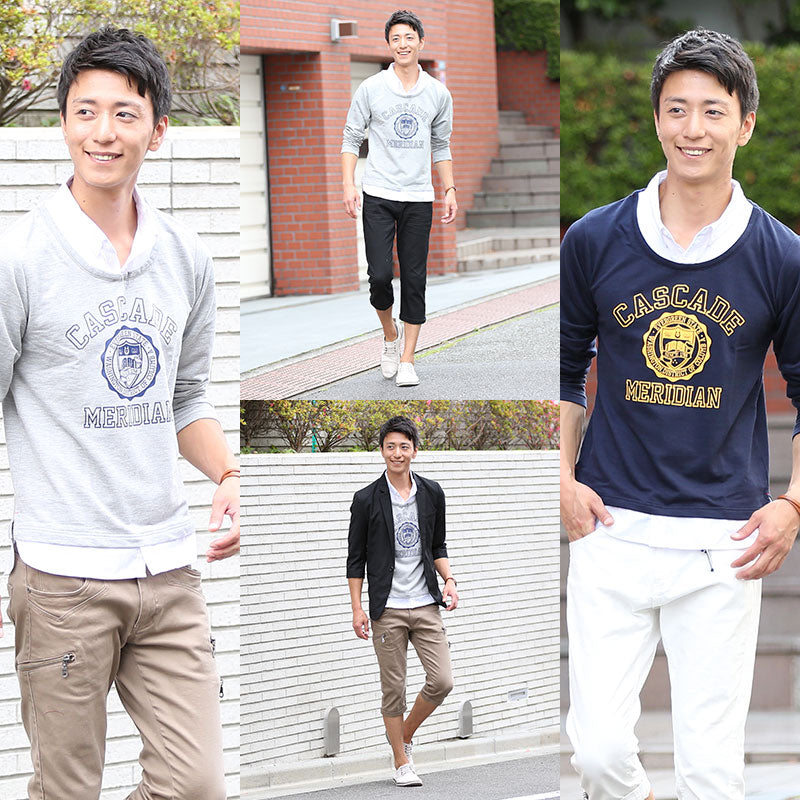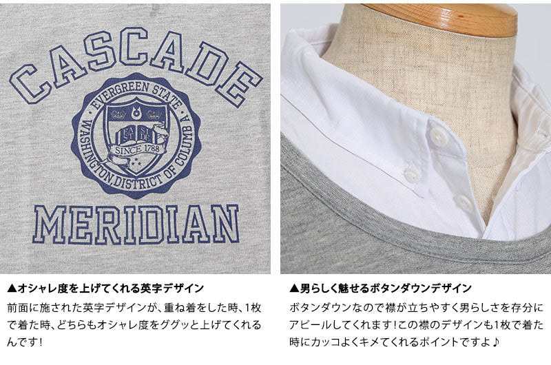 このカットソーはシャツの襟と裾部分だけカットソーとつながっていて、1枚で着ているのにまるで重ね着をしているかのようなオシャレを楽しめるんです!