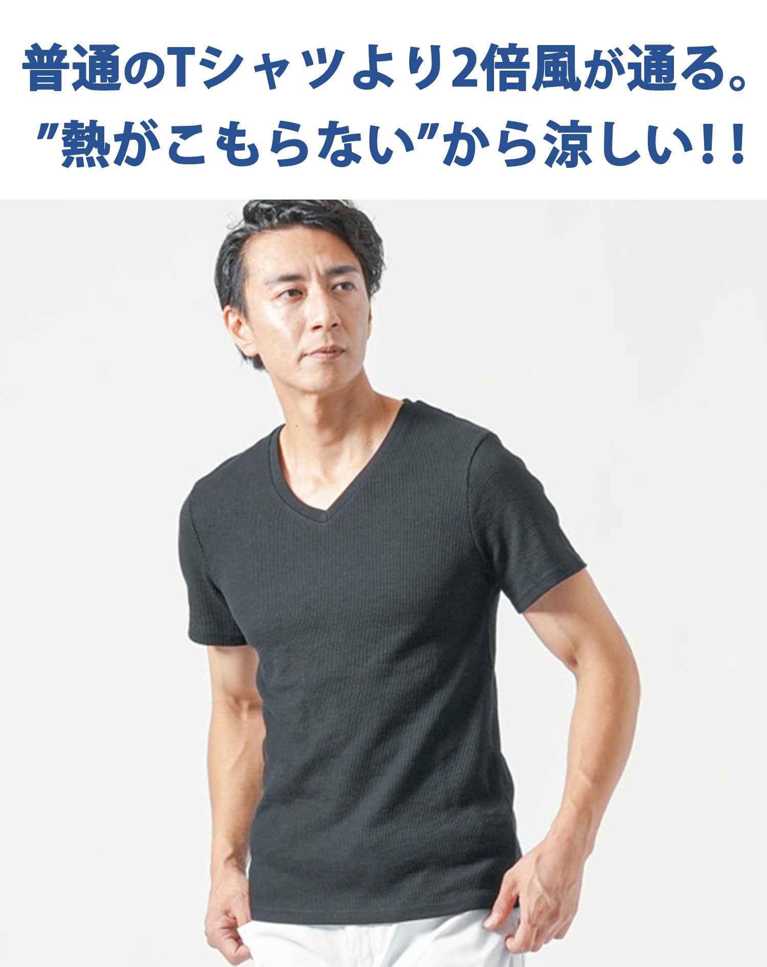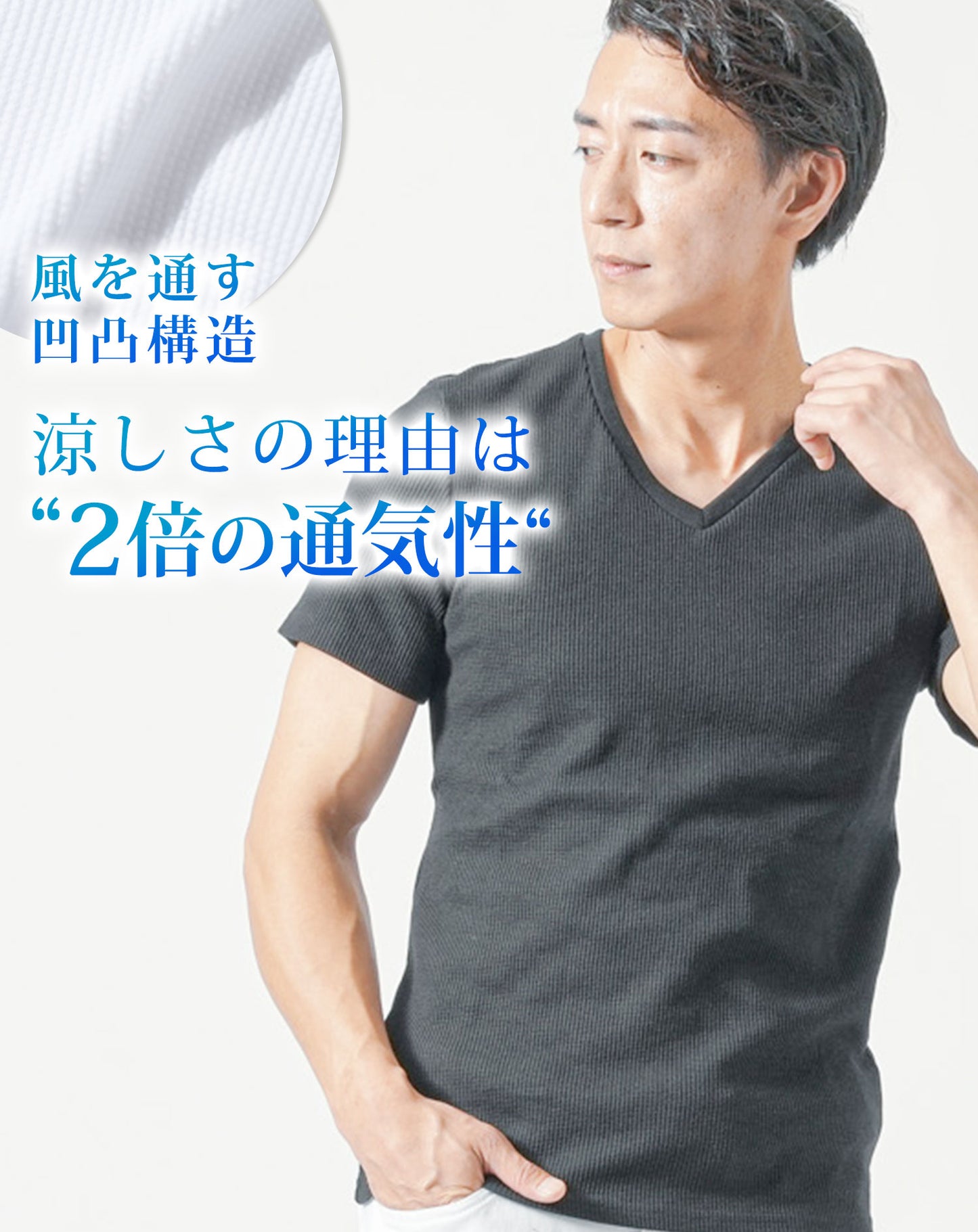 ワッフル素材を使用した半袖VネックTシャツ。凹凸のあるワッフル素材は肌への接地面が少なく涼しく着こなすことが出来ます。さらに吸水速乾性にも優れているので夏でも快適な着心地が長く続きます。素材感のあるTシャツなので1枚で着ても、インナーとしても活躍してくれます。スリムな細身シルエットなのでスタイリッシュなコーディネートが完成します。ストレッチが効いているので細身ながらもストレスフリーな着心地を味わうことが出来ますよ。