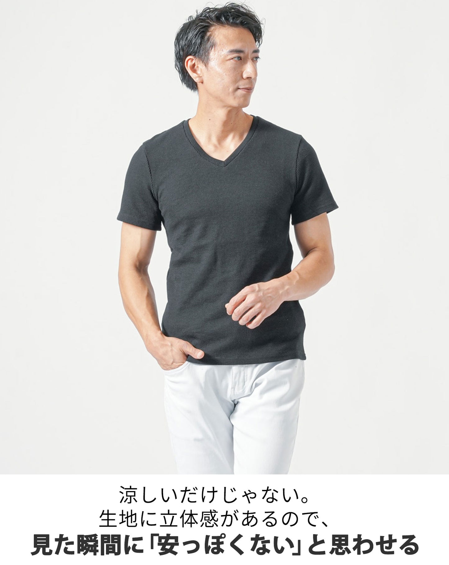 ワッフル素材スリムフィット半袖VネックTシャツ