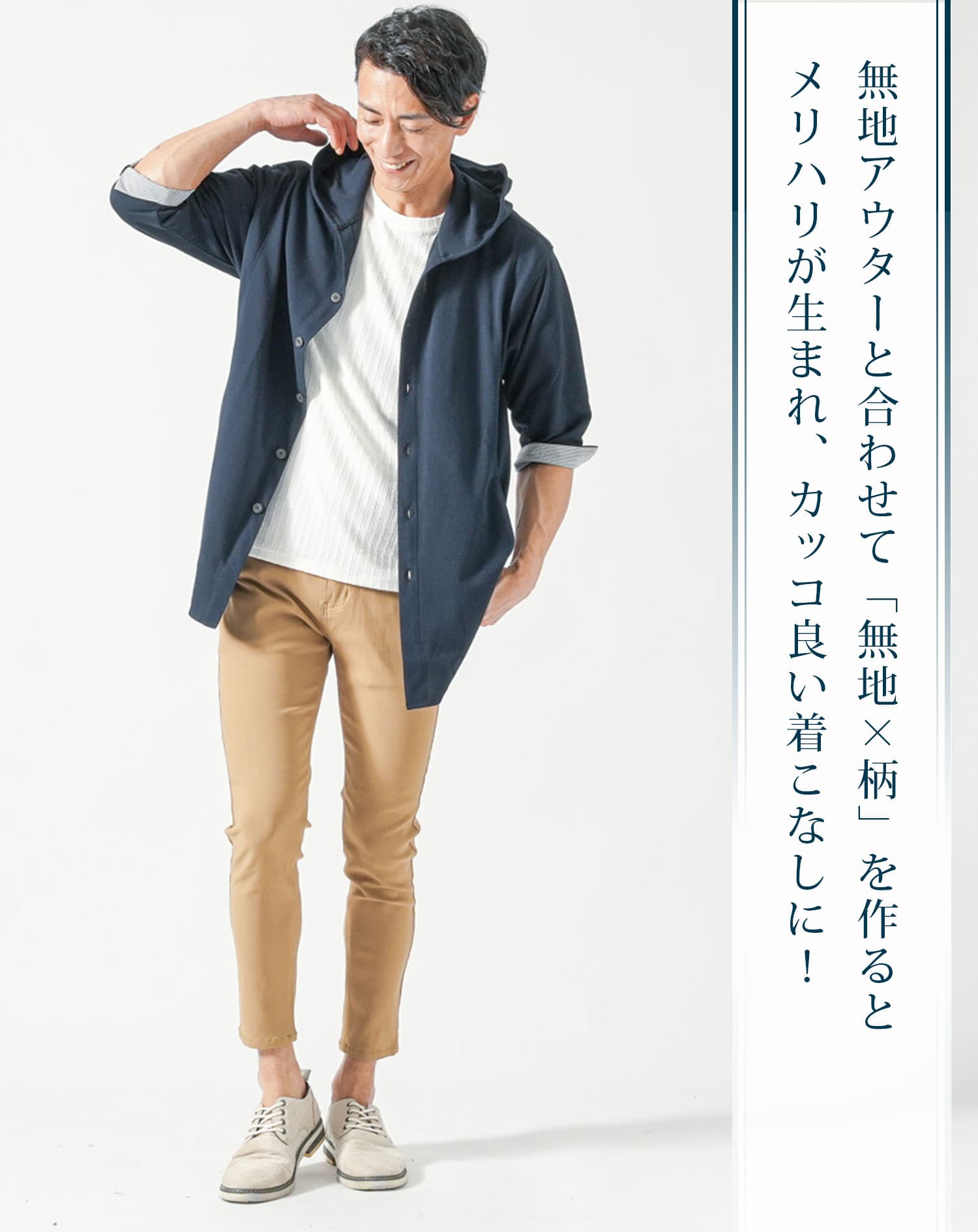 ストライプジャガード半袖クルーネックTシャツは、都会的なデザインと機能性を兼ね備えたメンズのための一着です。うっすらと施されたジャガード柄は、主張しすぎず、無地にはない独自の魅力を持ち、スタイリングの幅を広げます。スリムな細身シルエットは、体型を美しく見せる効果があり、特に40代、50代の男性にぴったり。ストレッチ性にも優れているため、軽やかな動きを実現し、ストレスフリーな着心地を提供します。これにより、デイリーユースから休日のカジュアルなコーディネートまで、幅広く活躍するアイテムです。ちょい悪ファッションを狙ったコーディネートにも最適で、シンプルながらおしゃれな印象を与えることで、周囲の視線を引き付けること間違いなし。夏の必需品として、ぜひワードローブに加えていただきたいおすすめの一枚です。