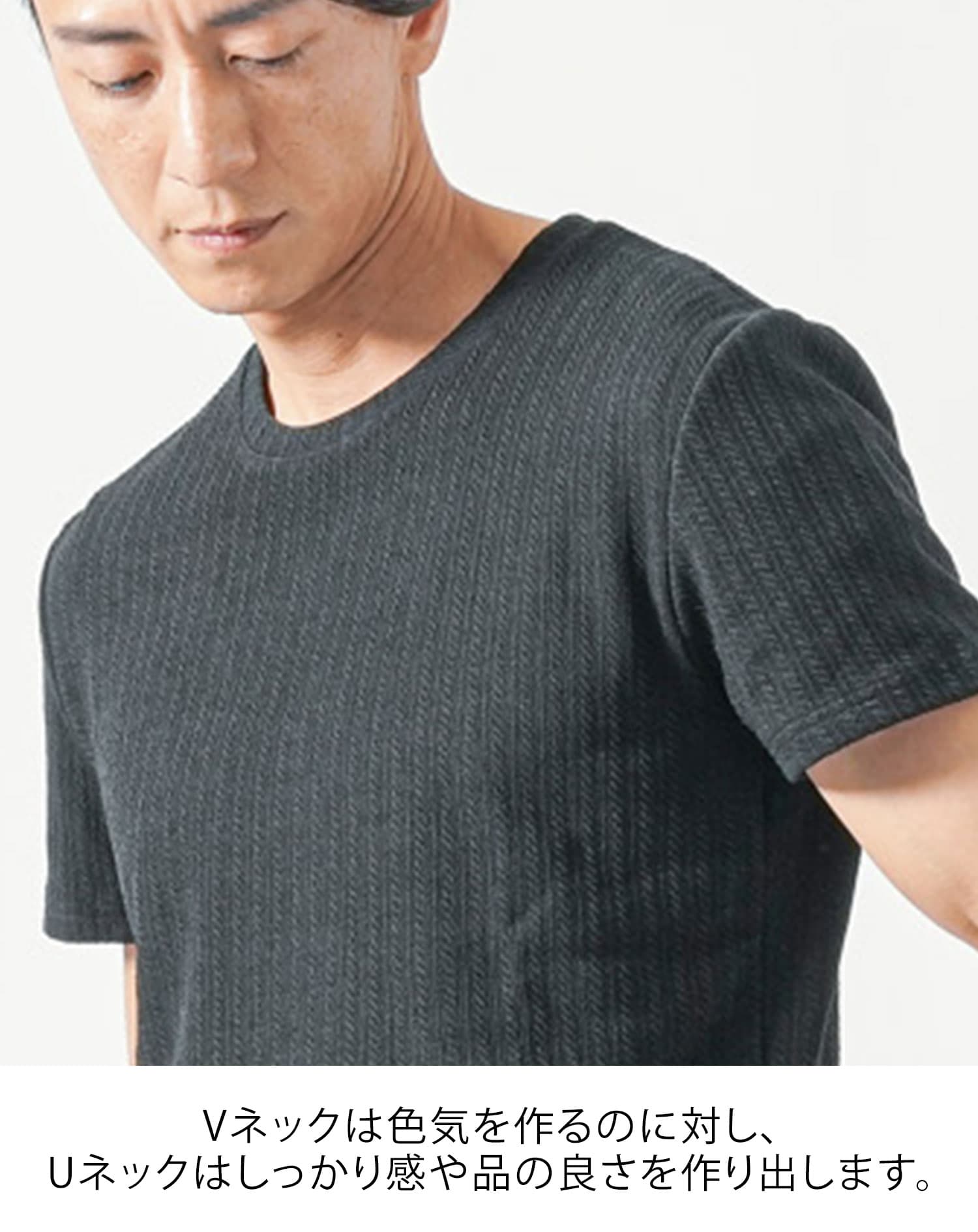 うっすらとジャガード柄が施された半袖Tシャツです。 主張しすぎない柄なので着回しも効いて便利な1枚です。 それでいて無地にはないかっこ良さがあるので、着るだけでおしゃれな雰囲気を作ってくれます。 スリムな細身シルエットなのでスタイリッシュなコーディネートです。 ストレッチも効いているので細身ながらも動きやすくストレスフリーな着心地を味わうことが出来ますよ。