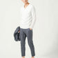 ダブルストライプ柄スリムテーパードイージーアンクルパンツは、スタイリッシュさと快適さを兼ね備えた一品です。太めのダブルストライプ柄が程良い存在感を演出し、上品かつ大人の雰囲気を醸し出します。このパンツはスリムな細身シルエットながら、アンクル丈で足首を見せることで、春から秋にかけての季節感を取り入れたコーディネートが可能です。伸縮性のある素材とドローコード付きのウエストデザインにより、ストレスフリーな着心地を実現。40代や50代の男性にこそおすすめしたい、ちょいワルでイケオジの魅力を引き立てるアイテムです。同素材のテーラードジャケットと合わせて、スマートなセットアップスタイルを楽しむこともでき、カジュアルからフォーマルまで幅広く活躍します。おしゃれなメンズファッションを追求するあなたにぴったりのパンツです。