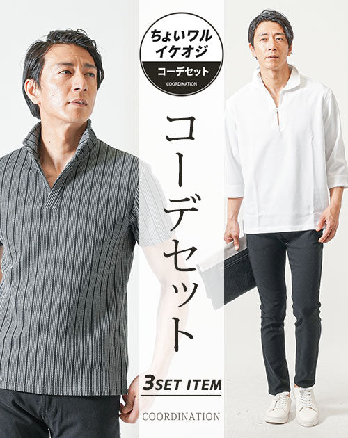 ちょいワル・イケオジメンズ夏の3点コーデセット 白7分袖カプリシャツ×グレー半袖ポロシャツ×黒スリムチノパンツ