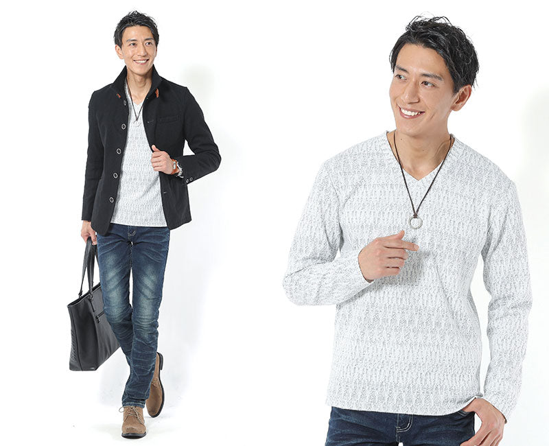 ヘリンボーンジャガードデザインⅤネックTシャツはいかがでしたか?