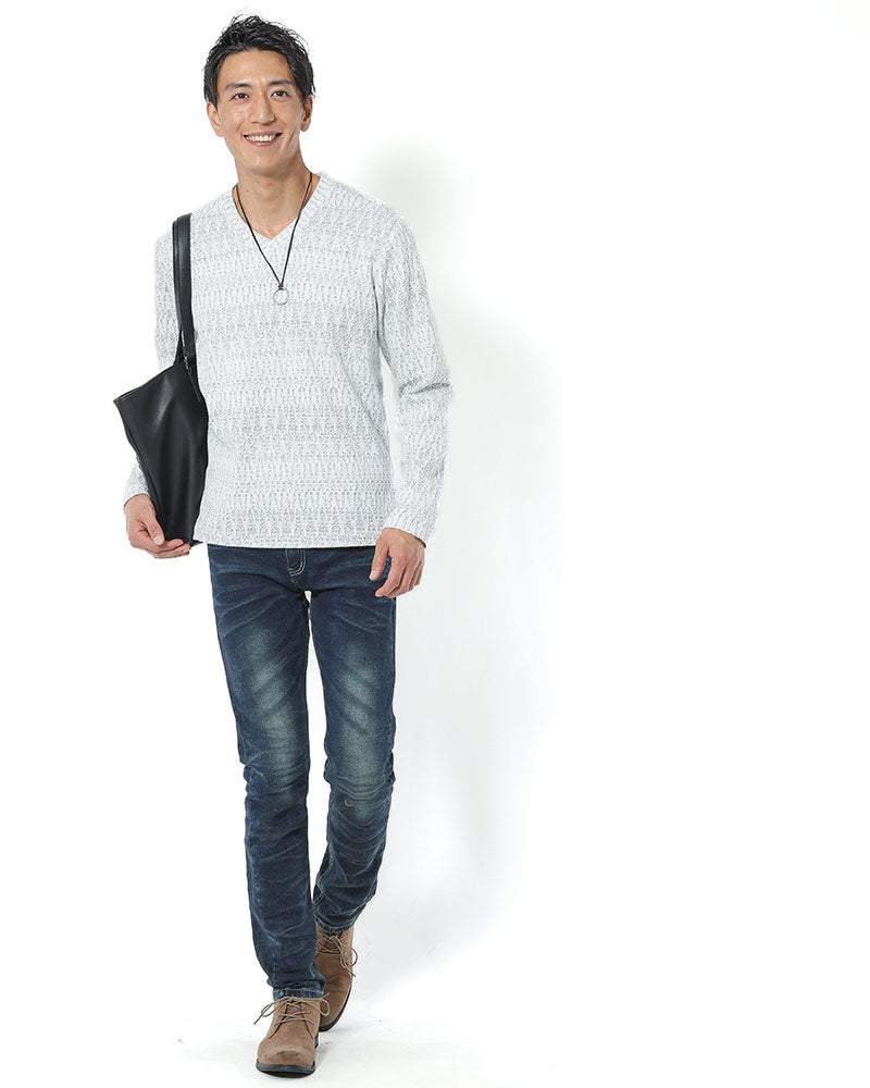 ヘリンボーンジャガードデザインⅤネックTシャツの着用画像
