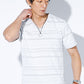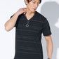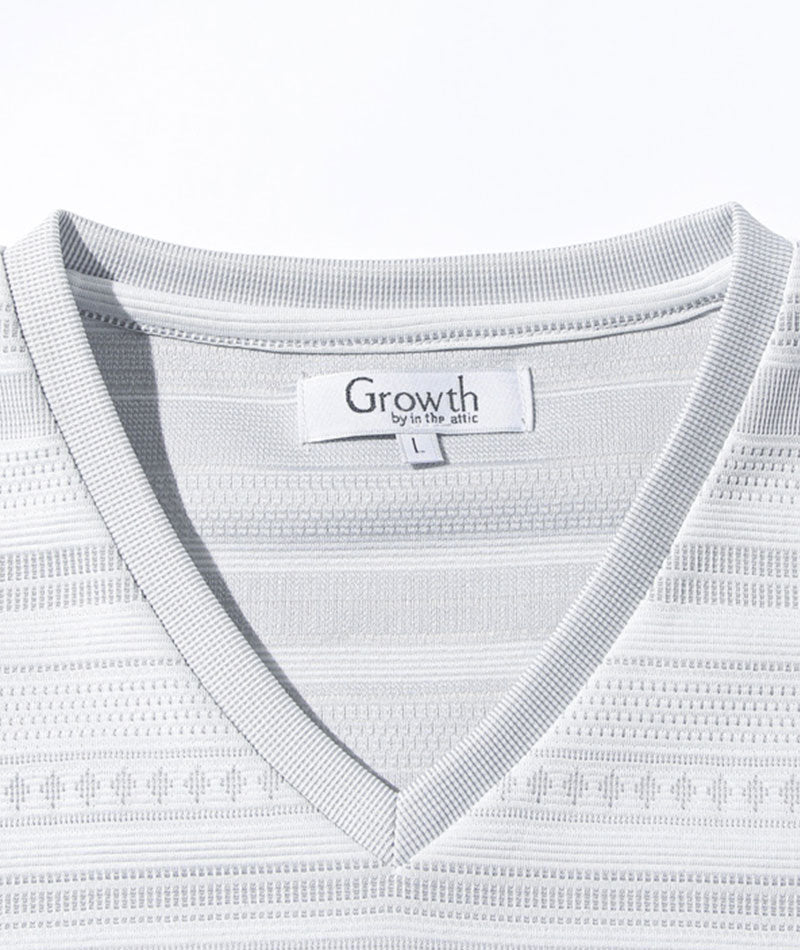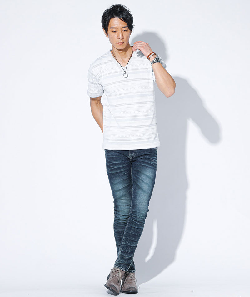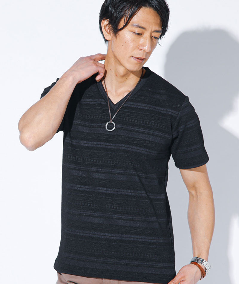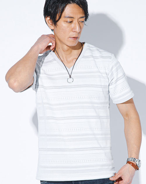 ジャガードボーダーデザイン半袖VネックTシャツ