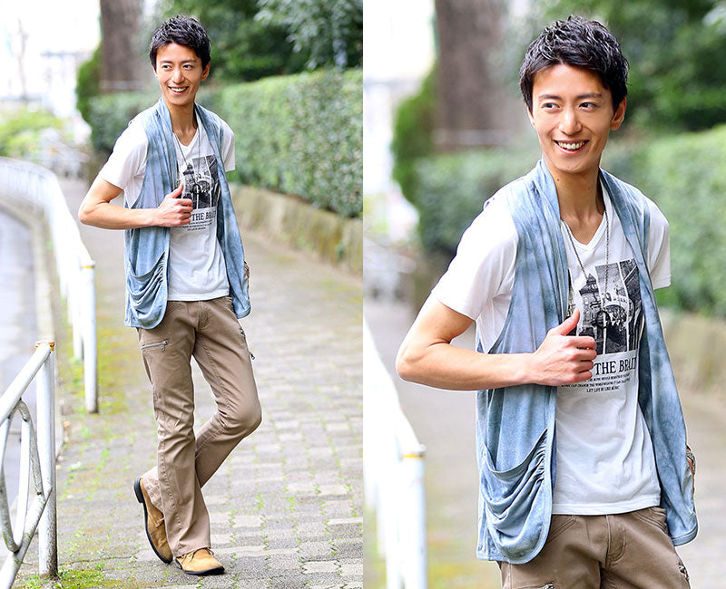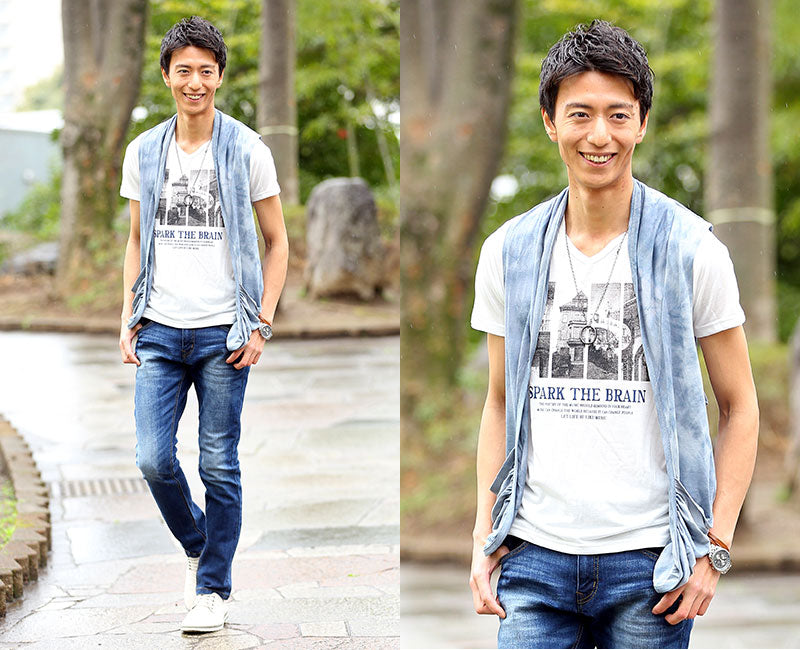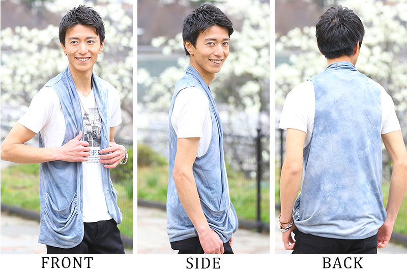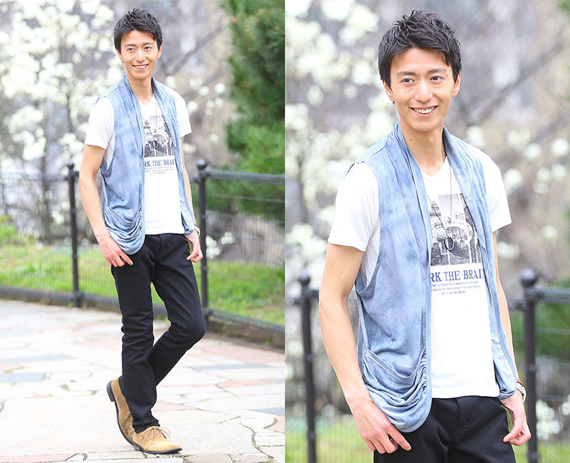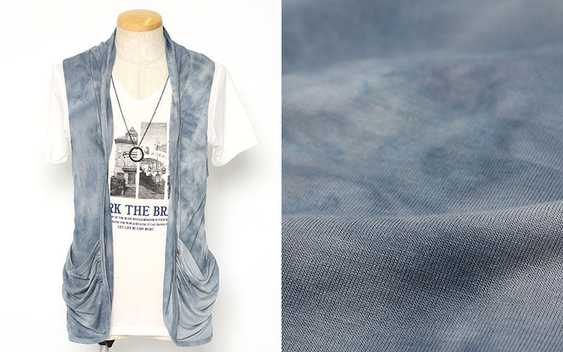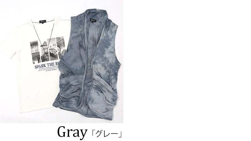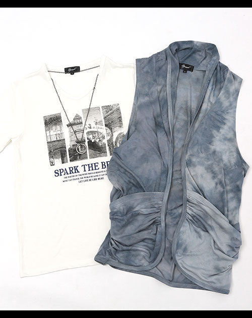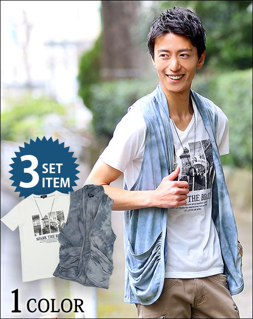 【カンタンにオシャレが完成!合わせやすさ抜群の3点セット!】ムラ染めジレ×半袖プリントカットソー×シルバーリングネックレス 3点セット