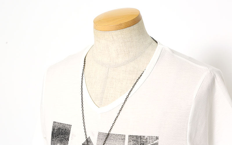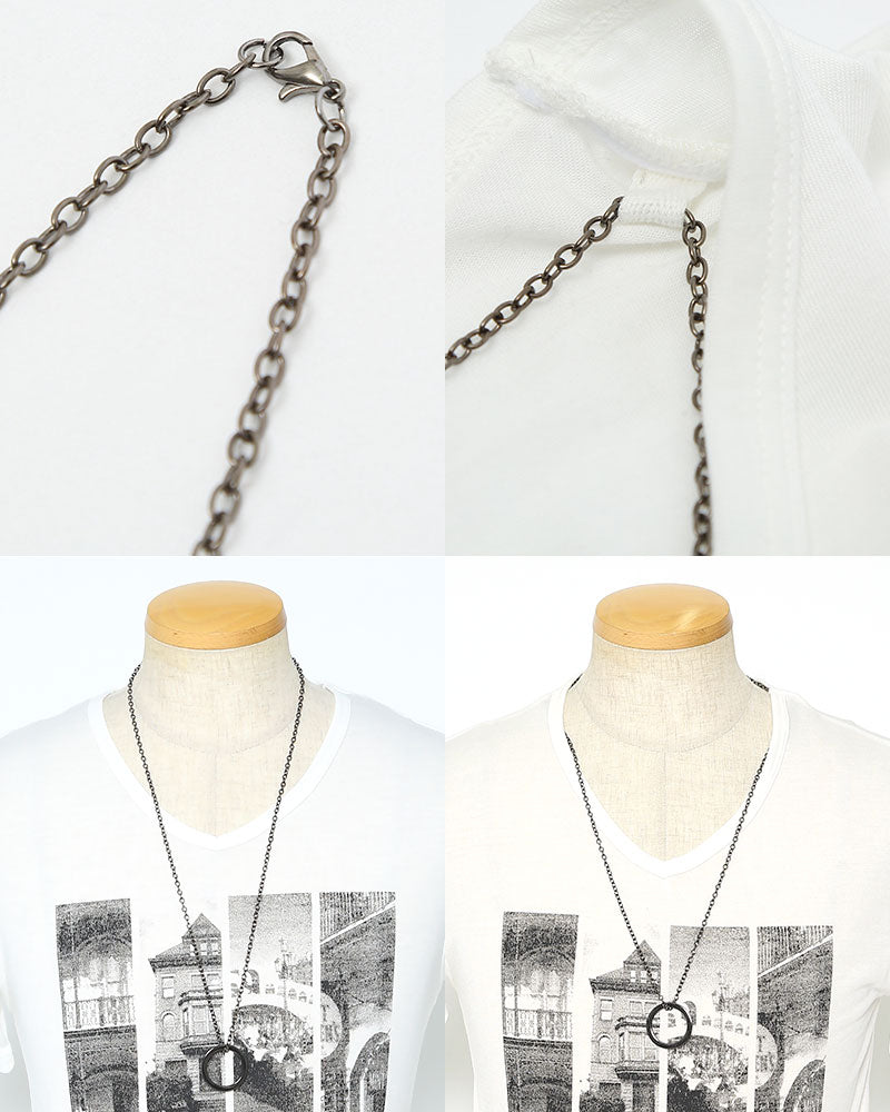 自分好みの長さに変えて魅せることができるチェーンデザイン。普通に首元から下げられるだけでなくカットソーについているループに通すことでより自然に、スッキリとした印象で魅せる事ができるんです!
