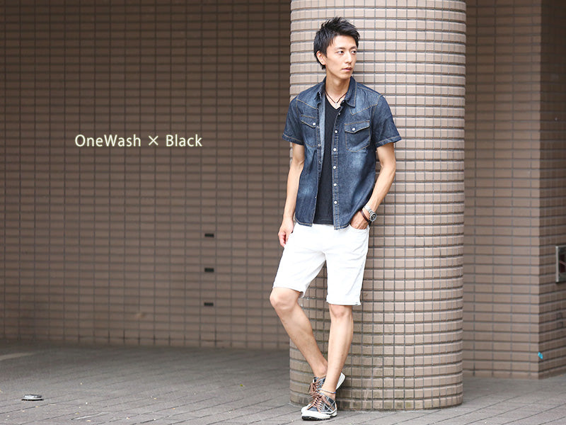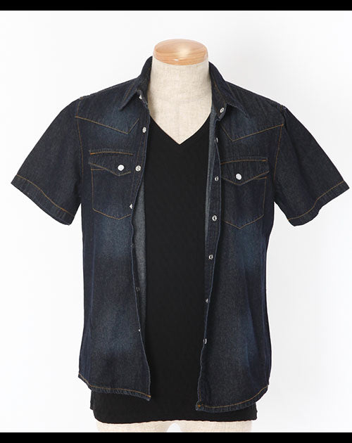 ウエスタン半袖デニムシャツ×ブロックジャガード半袖カットソー 2点セット