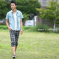 爽やかな色合いのトップスとグレー調のチェックデザインのボトムスが
