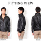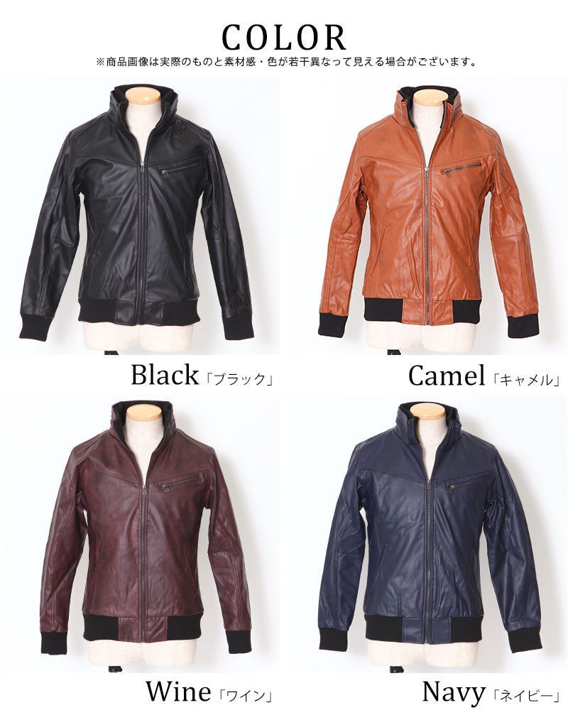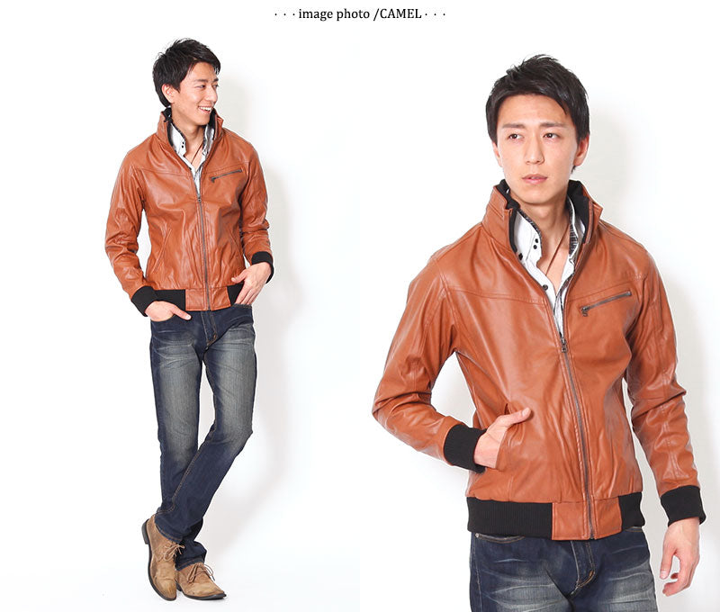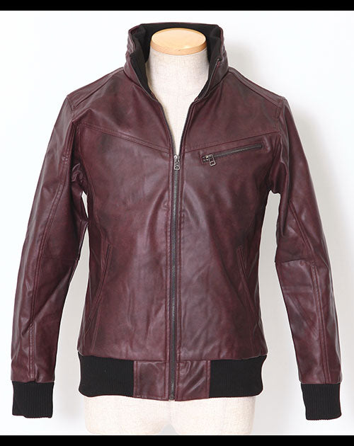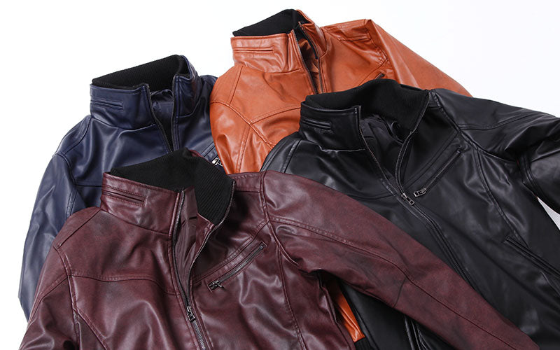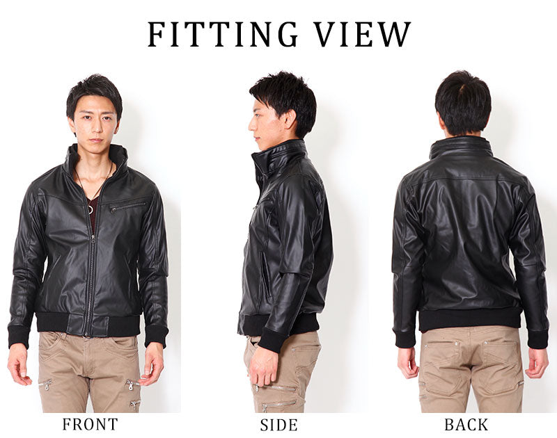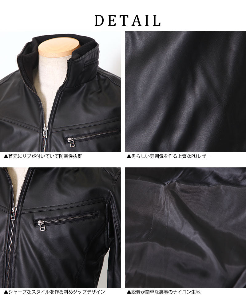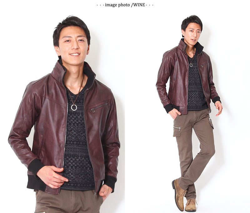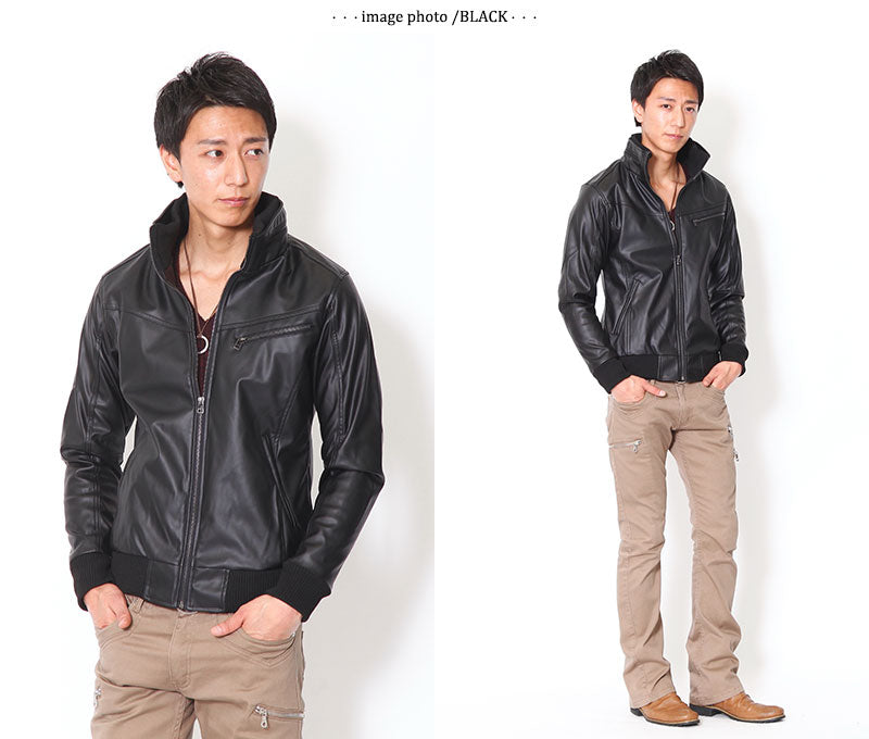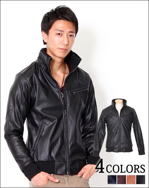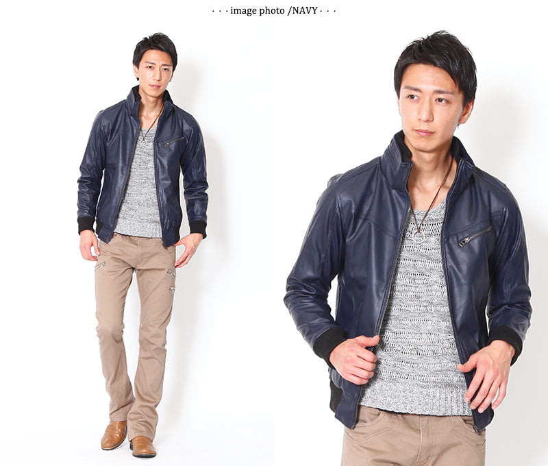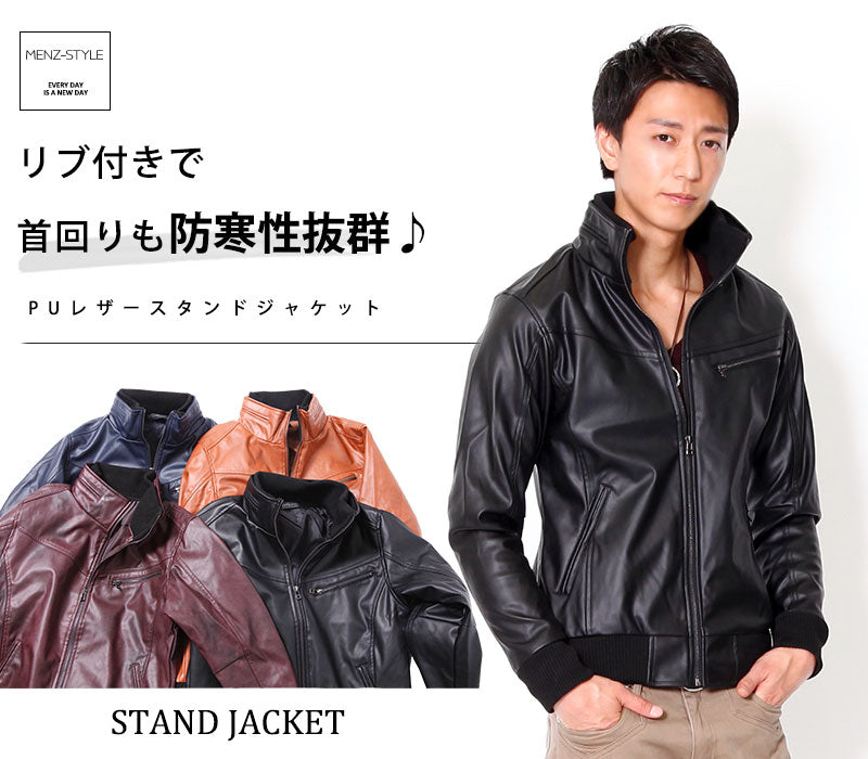 男らしい雰囲気を作るスタンド襟のPUレザージャケット。