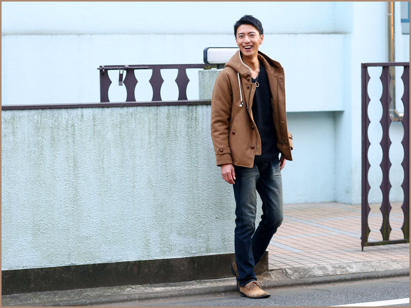 フード付きのコートを羽織る事で、カジュアルなスタイルに!